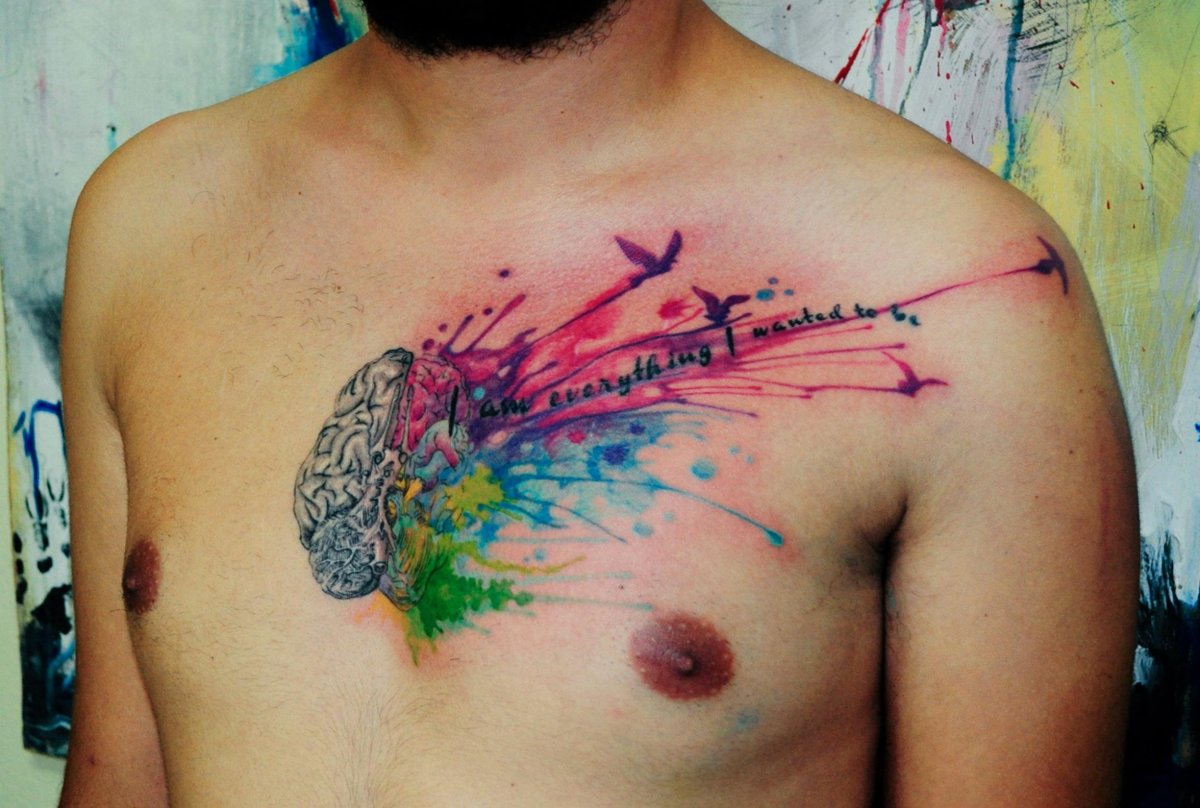 Вскоре татуировка акварель, эскизы которой не ограничиваются одними лишь цветочками, привлекла внимание и мужского пола. Мужские акварельные рисунки тяготеют к абстракциям и нарочито жестким сюжетам, компенсирующим мягкость воплощения ( , кровь, пугающие изображения)