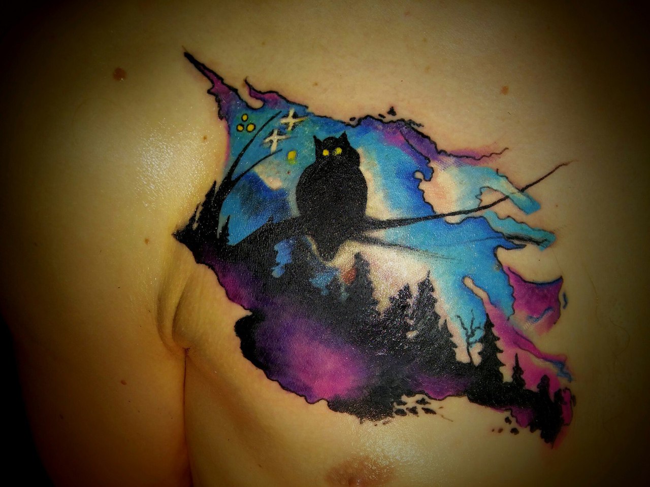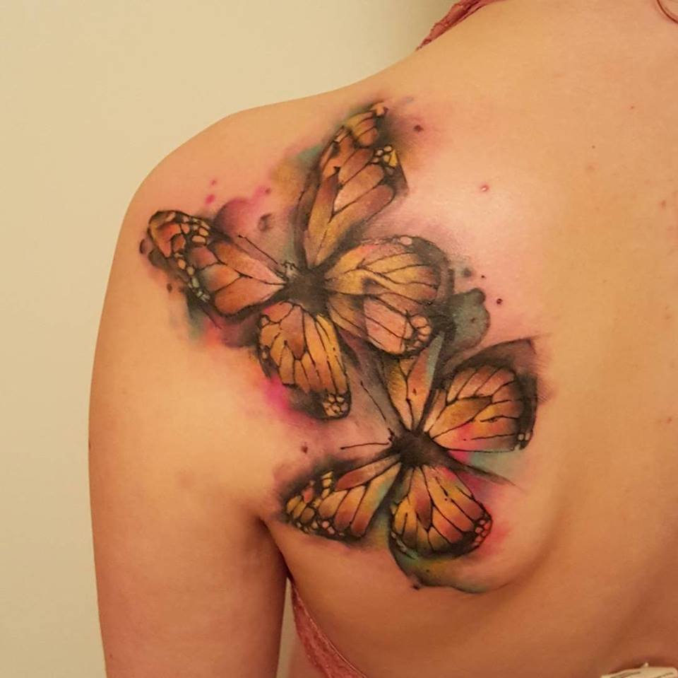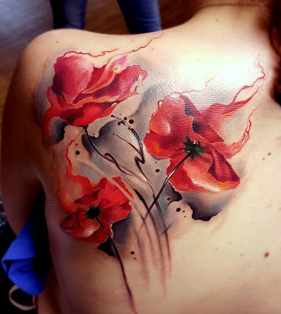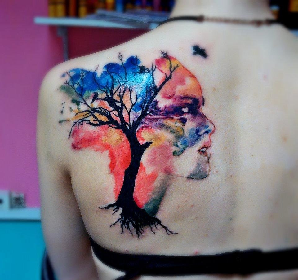 В тату такого вида нередко отсутствует традиционная черная окантовка. Это придает рисунку легкость, воздушность и колорит благодаря свободным мазкам, полутонам, свободно перетекающим друг в друга.