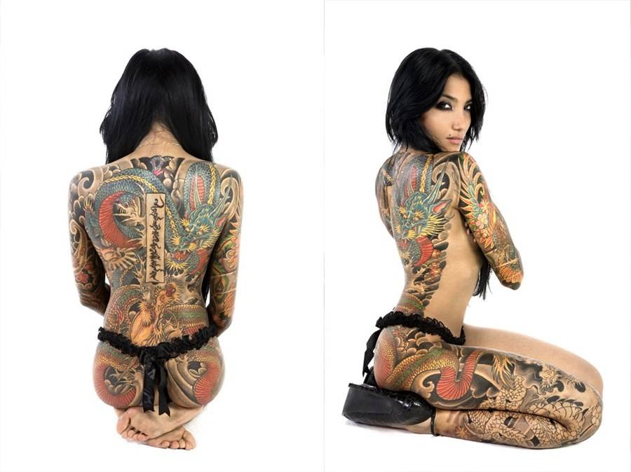 В Японии татуировки одинаково часто используются, как мужчинами, так и девушками. При этом девушки с помощью нательных рисунков демонстрируют свою покорность, хрупкость, нежность, женственность и красоту. Классические эскизы японских татуировок для девушек – это различные цветочные мотивы, например, лотос – символ непорочности, духовной загадочности и богатства, пионы – красота и успех в делах. Однако, истинным лидером японских татуировок для девушек является сакура – древний образ, символизирующий жизнь и глубокий философский смысл, олицетворяет женскую мудрость. Еще один вариант тату для девушек – японский сад, изображенный на спине, который олицетворяет оригинальность и харизму своей владелицы.
