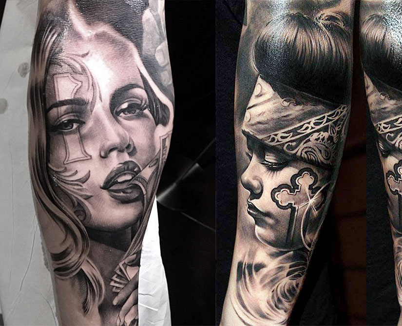 Стиль чикано, тату-эскизы привлекает леди их же портретами. Если мужчины наносят женские образы, чтобы подчеркнуть тягу к ним, то девушки выбирают зарисовки, чтобы передать свое эмоциональное состояние.