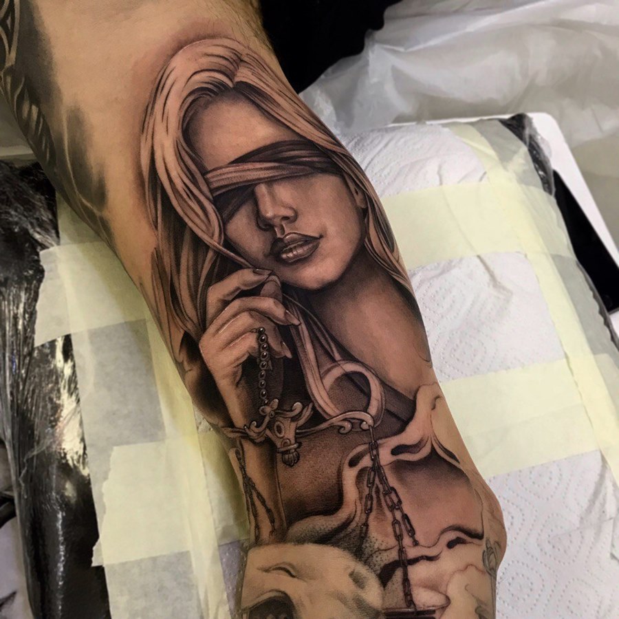 Основной глубокий символизм таких татуировок– это истинная вера, тщетность бытия и справедливость высших сил, которая настигнет каждого. Причем, законодательство и судебная система в это понятие не входили. В основе рисунков по-прежнему преобладает черный цвет и его оттенки. Но сегодня можно встретить и изображения с добавлением красного, зеленого и некоторых других цветов. Но яркости и колоритности все равно не будет. Показывается лишь ненавязчивая и аккуратная расстановка акцентов.