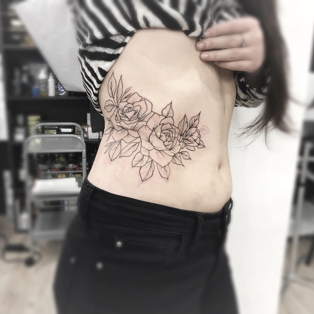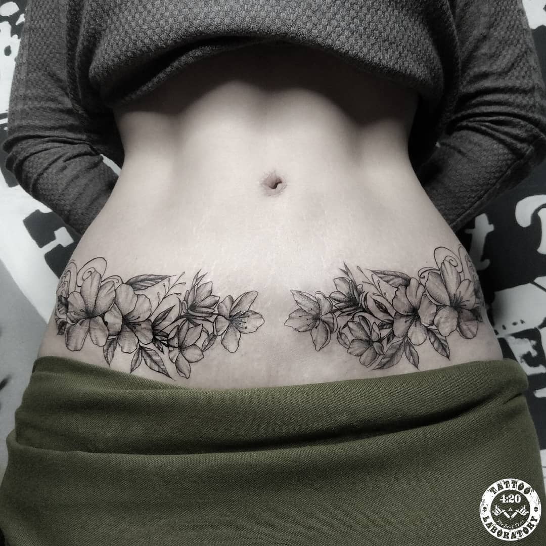 Многие девушки наносят цветочные мотивы на шрам после аппендицита или кесарева сечения, чтобы красиво его замаскировать. Отличным выбором станут розы, сакура, лилии, пионы и любые другие цветочные композиции.