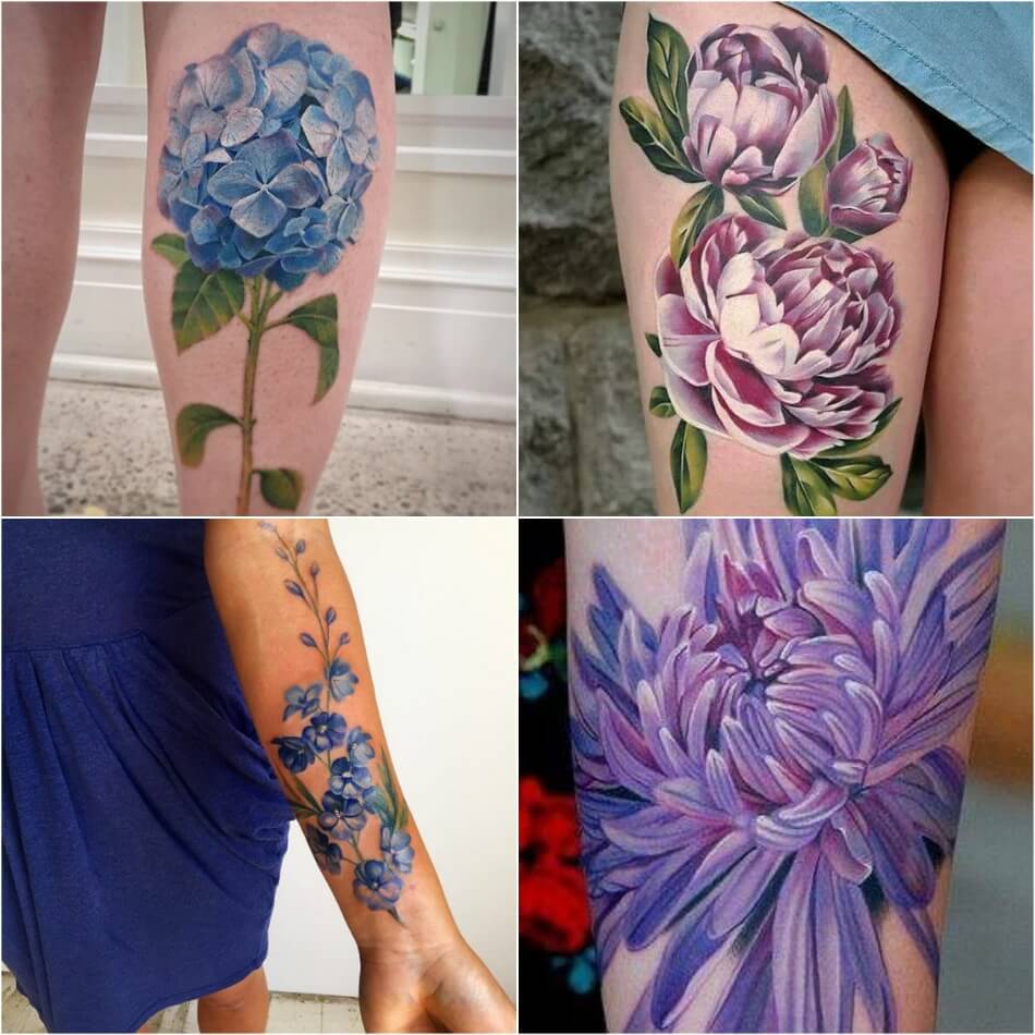 - Женские наколки в виде цветов могут наиболее полноценно передать все красоту данного творения природы. Этого можно достичь путем игры тенями, добавлением бликов.