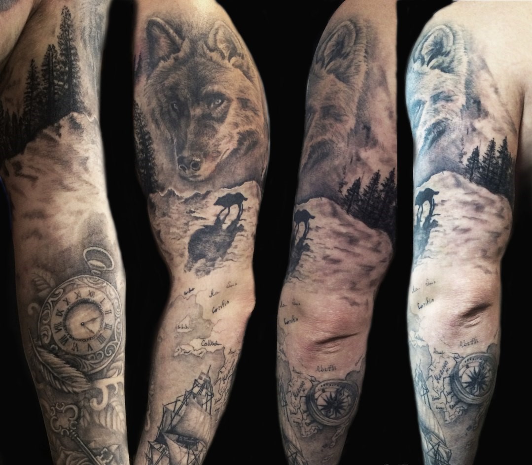 Самый популярный тренд последних лет – рукав в стиле реализм. Такая наколка полностью перекрывает окружность руки, представляя собой объемное сюжетное изображение. Оно включает в себя сочетание разных портретов, природных явлений, зданий, фэнтези и др.