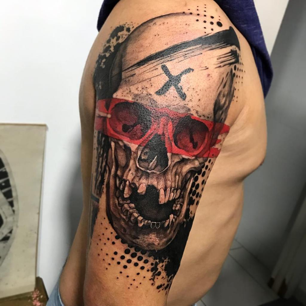 Еще один известный стиль — трэш полька. Дерзкая, агрессивная и динамичная роспись в черно-красных тонах. Эффект строится на ярких контрастах и брутальных картинках. Иногда можно встретить небольшие фрагменты в стиле орнаментал или трайбл, выполненные в виде браслета.