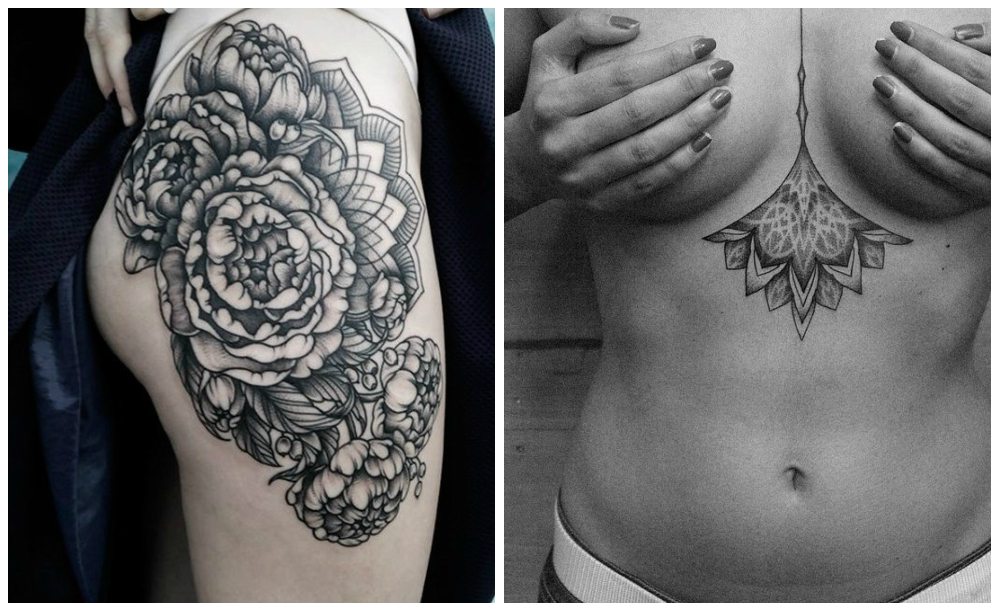 Стиль дотворк отличается четкостью и графичностью. Наиболее выигрышно смотрятся масштабные татуировки, заметные издалека. Это обусловлено тем, что в узоре учитывается не только размер точек, но и расстояние между ними. Лучше всего на теле такая тату будет смотреться на спине, между лопаток, «рукава» на руках, в области ключицы – так называемые «воротники». Пожалуй, именно в этом стиле очень красиво выглядят симметричные татуировки под грудью у девушек.