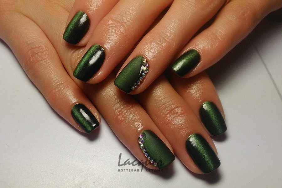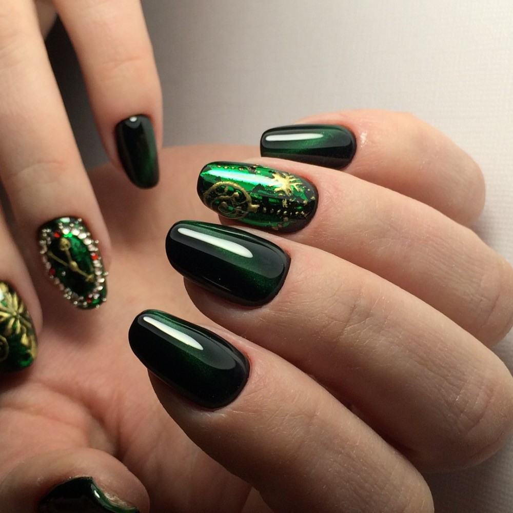 Отлично смотрится на длинных, коротких ногтях. Зеленый цвет маникюра самодостаточен, не требует дополнительных украшений. Но если выбранный дизайн это подразумевает, то лучше использовать декорирование стразами или камнями. Такие элементы декора придутся под стать зеленому маникюру «кошачий глаз». Блески, бульонки и пр. только удешевят внешний вид зеленых ноготков. Истинной стильной ноткой в образе станет глубокий изумрудный оттенок маникюра.