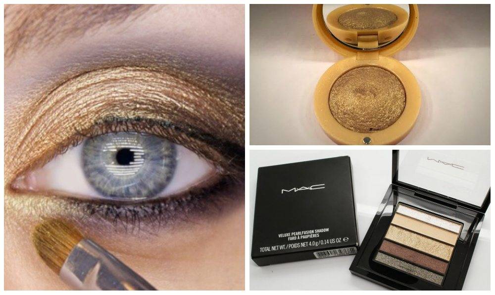 - M.A.C. Палетка теней из 5 золотистых оттенков Veluxe Pearlfusion Shadow позволит создать блестящий смоки-айс или золотой дымчатый макияж. Тени имеют среднюю стойкость, для ее повышения наносить тени лучше слегка влажной кистью, смочив ее фиксатором для макияжа. При нанесении на базу блеск смягчается. Стоимость около 2000 рублей.