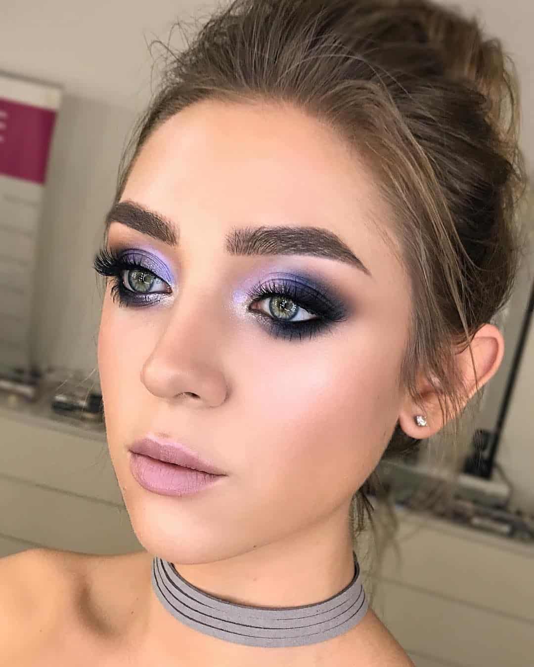 Потрясающе смотрится зеленый взгляд с переливами лилового. В зависимости от интенсивности нанесения, этот нежный цвет можно использовать для создания строгого офисного или нарядного праздничного лука. Более всего лиловый подходит для оливковых глаз.