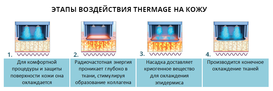 Радиоволновая энергия, генерируемая аппаратом для проведения Thermage-терапии, проникает в глубокие слои дермы и нагревает расположенные в них волокна коллагена до так называемой температуры уплотнения. Отличительной особенностью процедуры является пролонгированный эффект: воздействию подвергается не только уже сформированная коллагеновая прослойка (кожа подтягивается и внешне выглядит моложе), но и структуры, отвечающие за синтез новых фибрилл, который активно продолжается в течение полугода после RF-лифтинга.