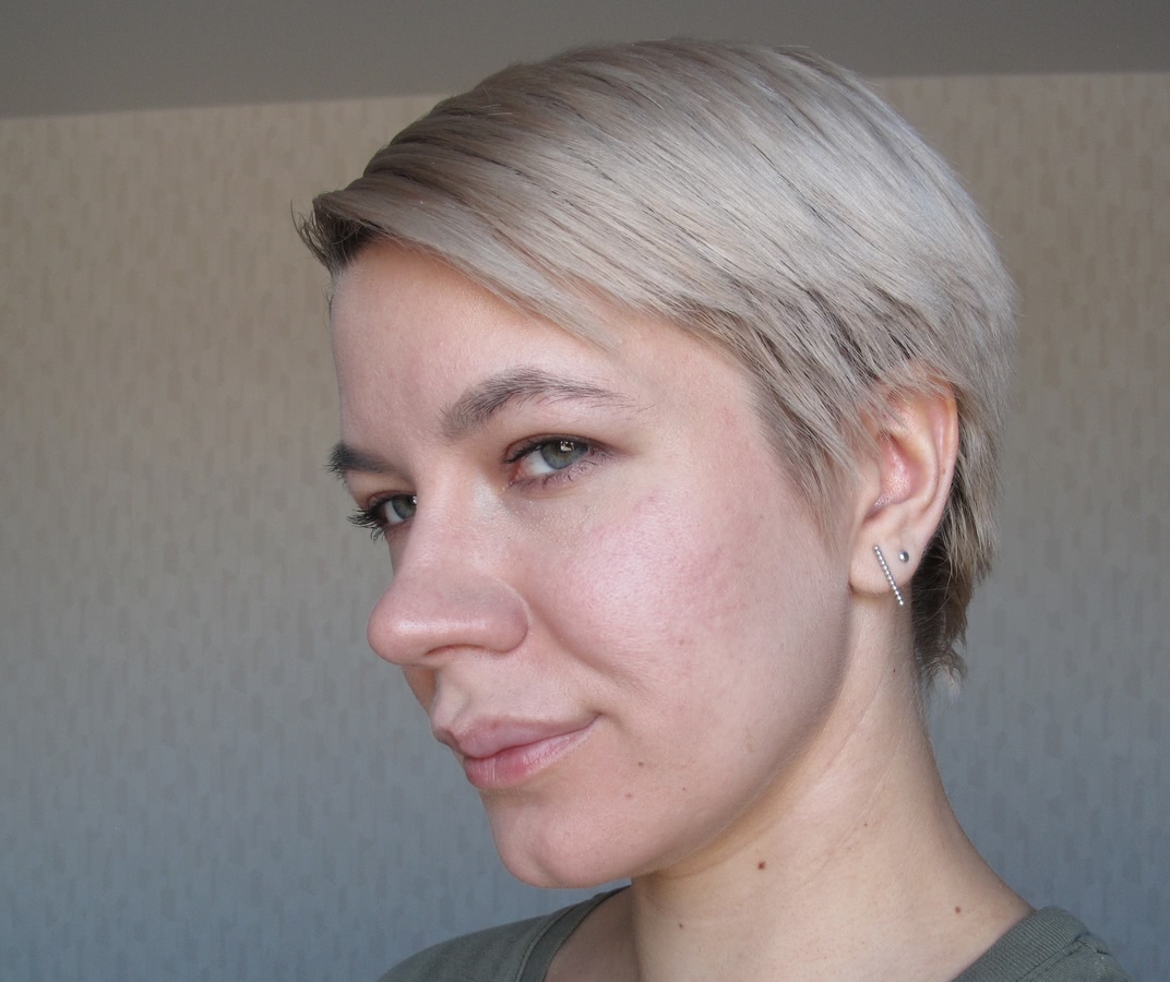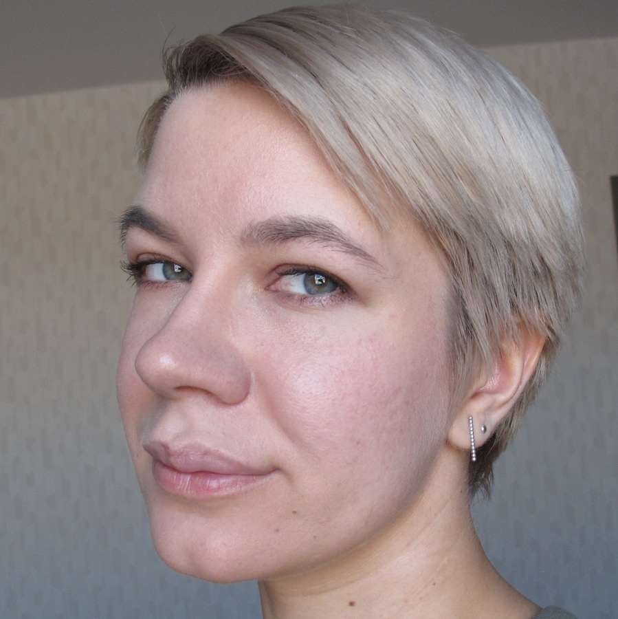 Как видно, тон не сильно кроющий, поэтому не очень хорошо скрыл красноту лица; также он немного светлее, чем мне сейчас нужно.