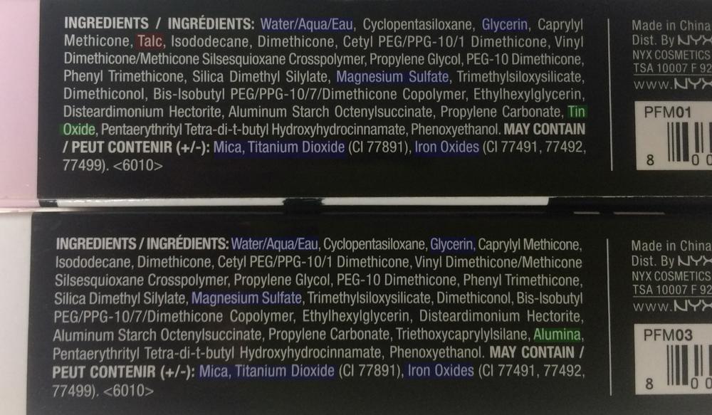 Состав у разных оттенков продукта не совсем одинаковый. На сайте NYX сообщается, что Tin Oxide – оксид олова (на фото выделен зеленым цветом) присутствует только в двух: «Opalescent» и «Luminous» – в средствах, придающих сияние. Хотя он считается матирующим компонентом. Неорганический УФ фильтр Alumina – оксид алюминия (выделен зеленым) – только в белом, оливковом и темно-коричневом. В списках ингредиентов «Opalescent» и «Warmth» мелькает тальк (на фото выделен красным).