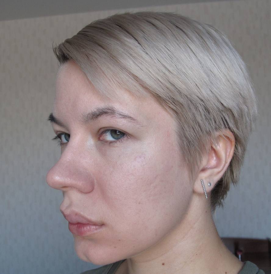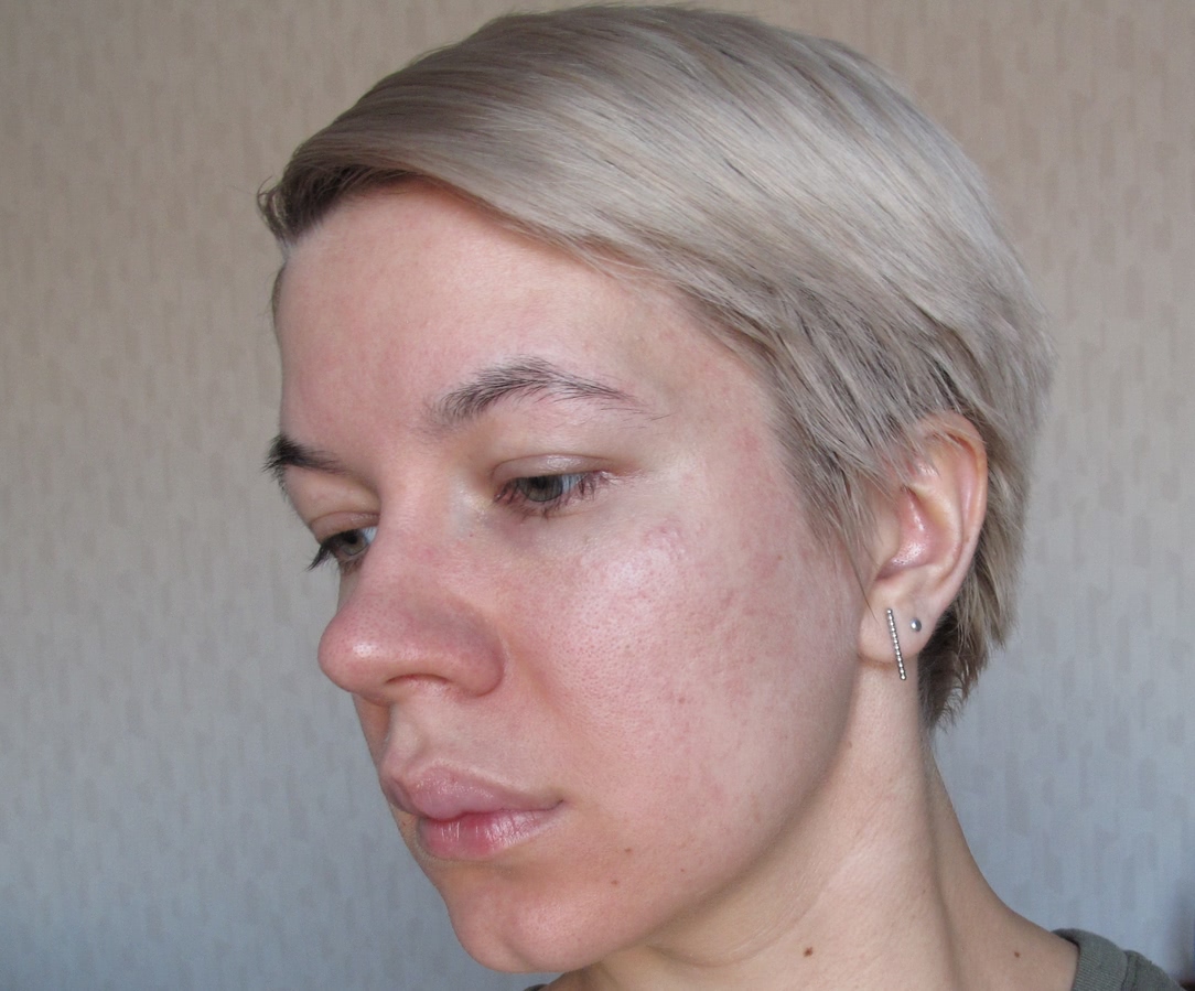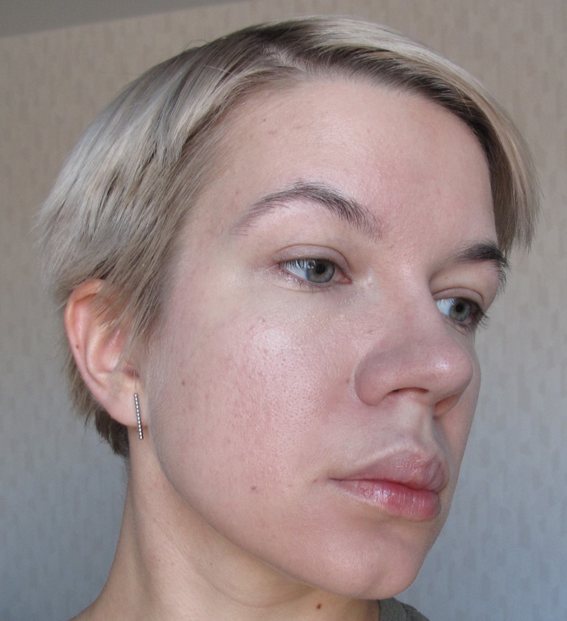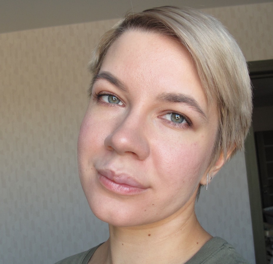 Как видно, тон не сильно кроющий, поэтому не очень хорошо скрыл красноту лица; также он немного светлее, чем мне сейчас нужно.