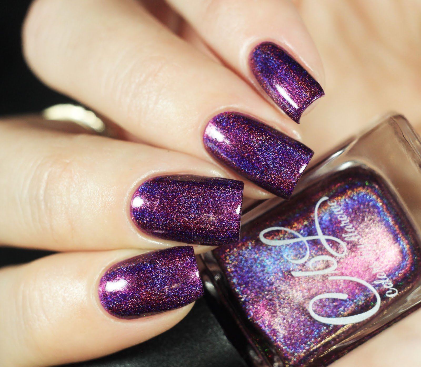 Красиво выглядят нейл-арты, выполненные фиолетовым гель-лаком, в котором уже присутствует перламутр или глиттер. Такое покрытие не нуждается в дополнительном декоре, гель-лак красиво переливается и “играет” при свете.