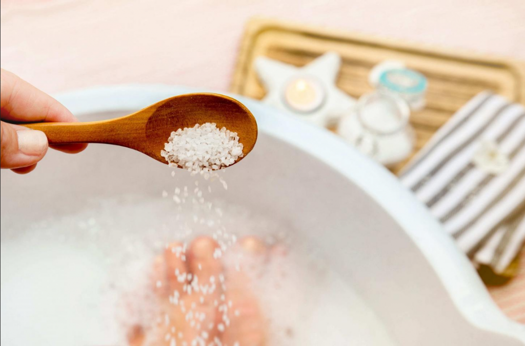 С морской солью. На ванночку для ног достаточно 2 ст. л. соли крупного помола. Морская соль богата минералами и микроэлементами, поэтому не только дезинфицирует кожу, но и питает, оздоравливает.