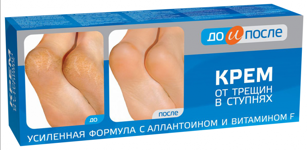 - Крем «До и После». Имеет в составе аллантоин и витамин F, а также активный растительный компонент. Предназначен для ухода за потрескавшимися пятками. Его цена колеблется в районе 60-100 рублей.