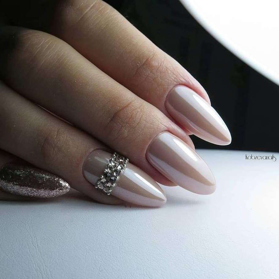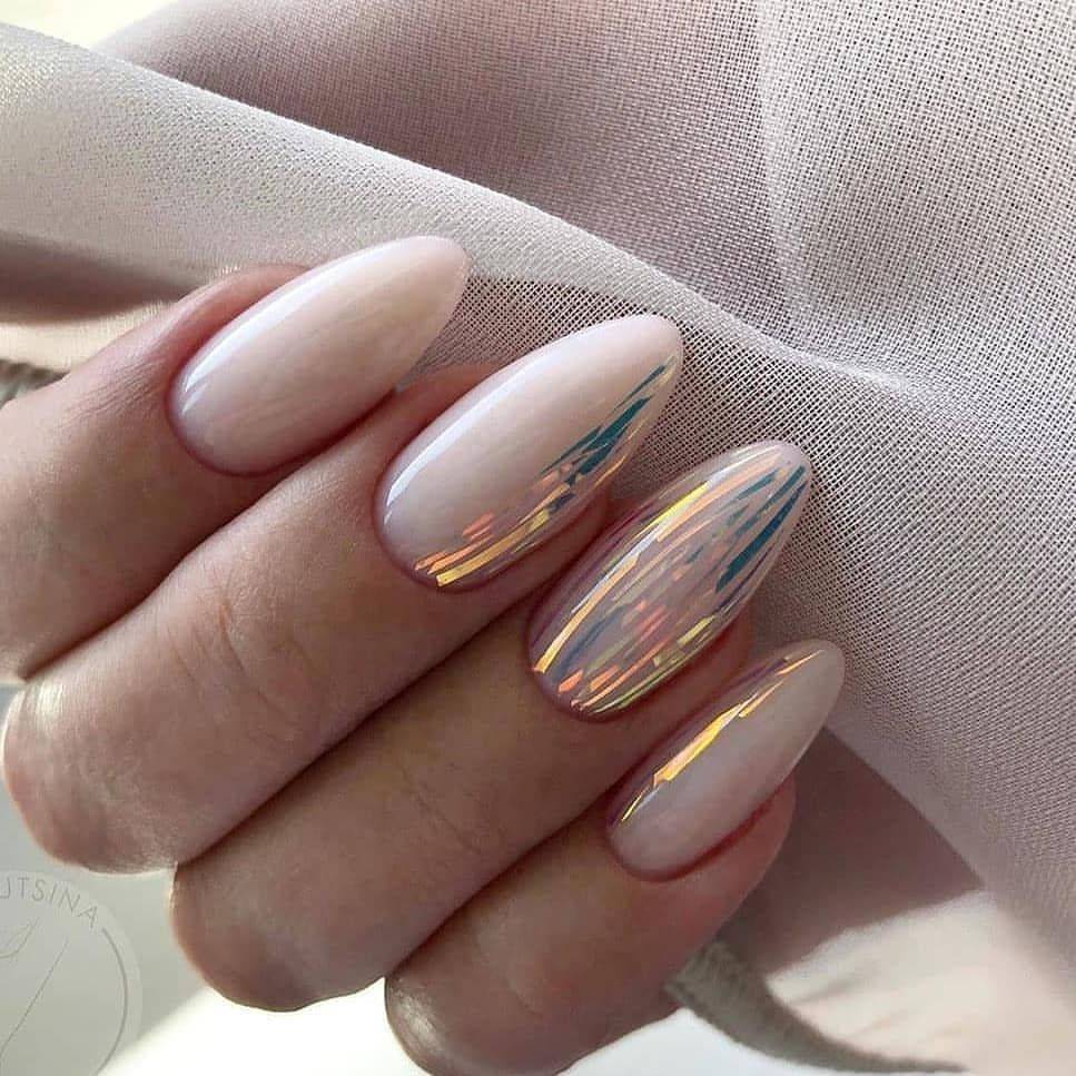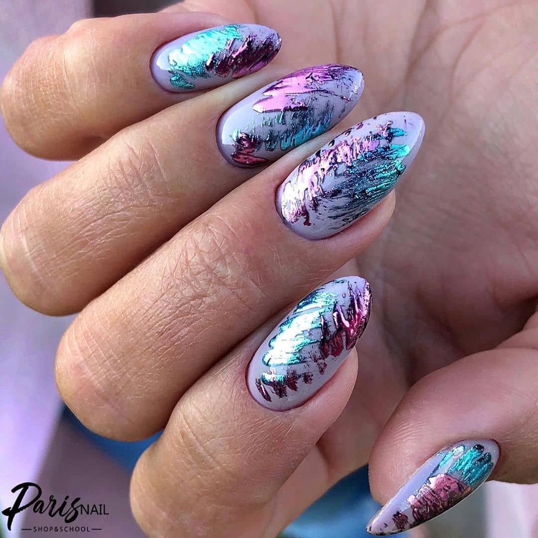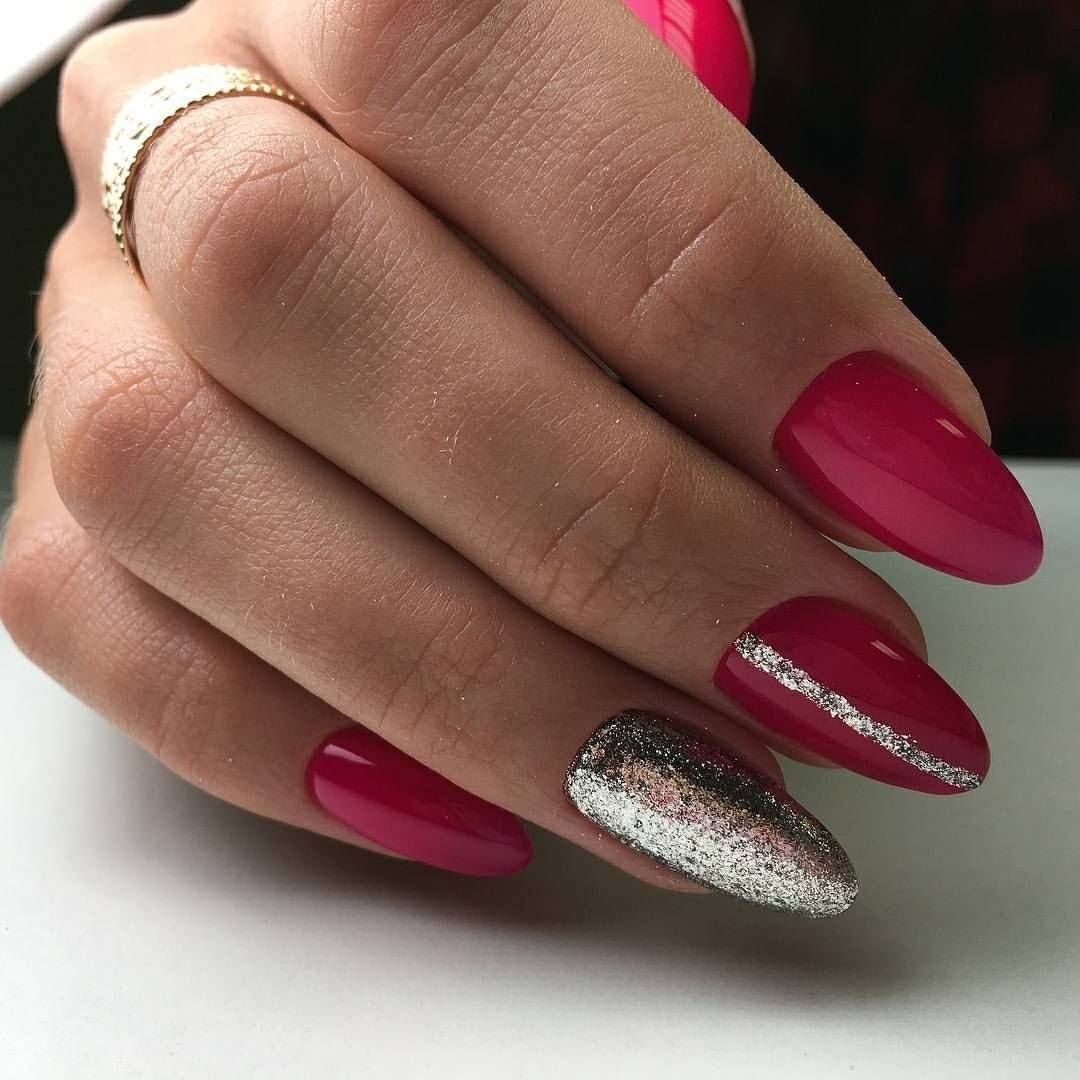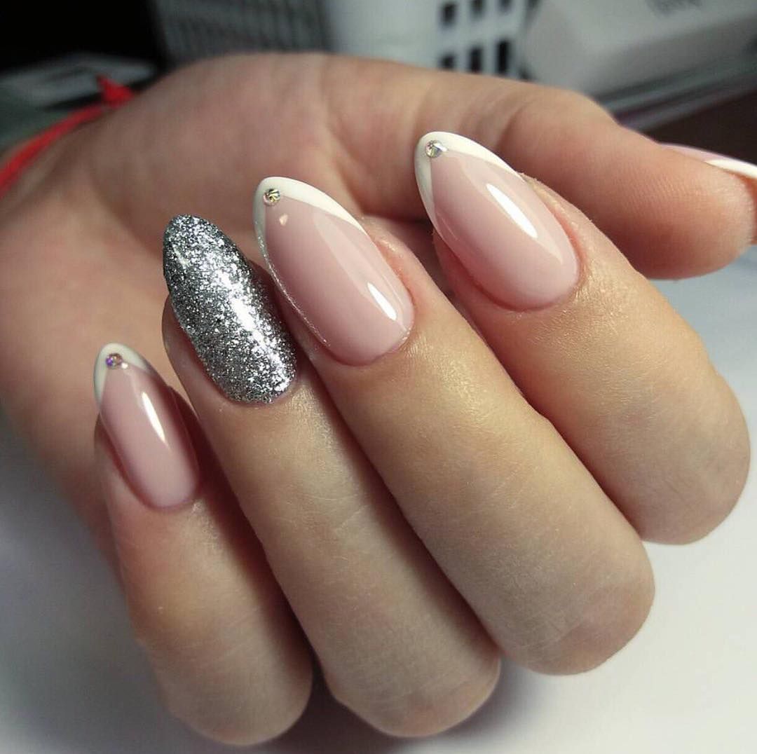 Добавьте серебристой фольги, стразов или глиттера, чтобы маникюр на миндальную форму ногтей приобрел праздничную тональность.