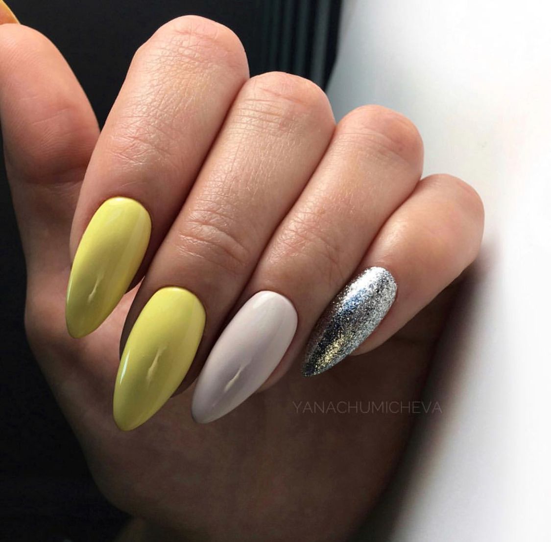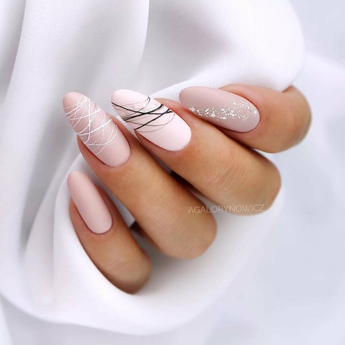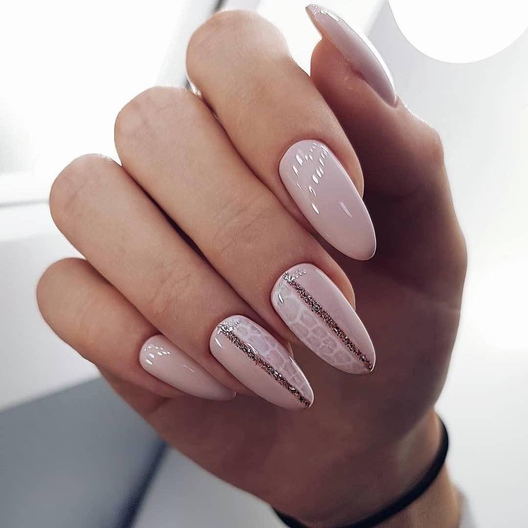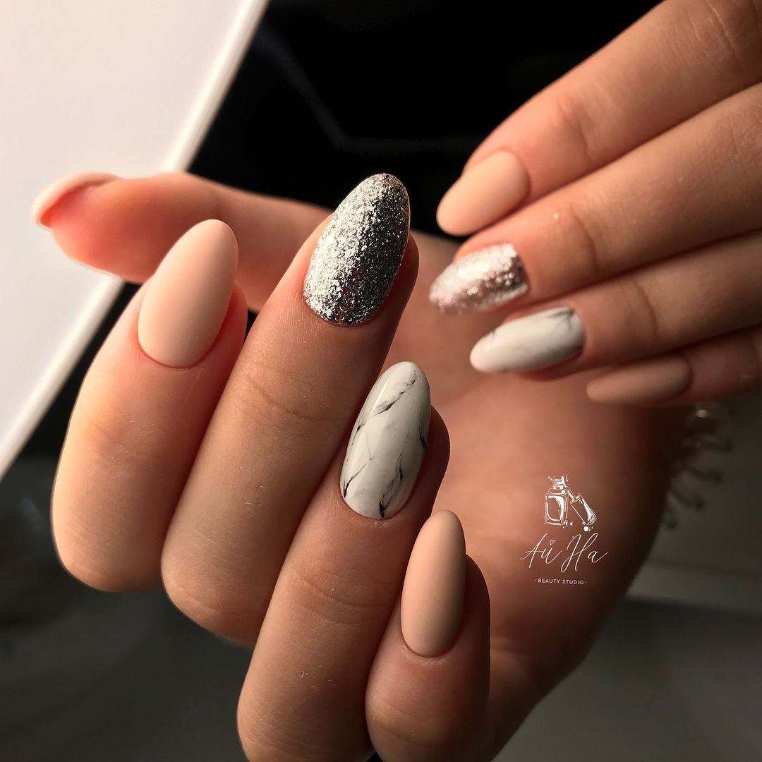 Добавьте серебристой фольги, стразов или глиттера, чтобы маникюр на миндальную форму ногтей приобрел праздничную тональность.