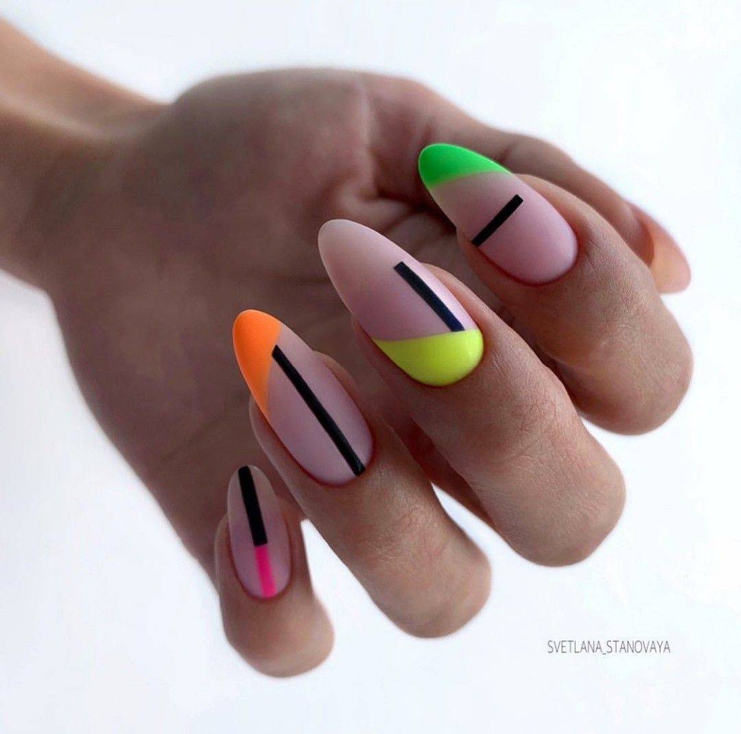 Трендовым сочетанием в этом сезоне, частенько применявшемся на миндалевидных ноготках, стало негативное пространство и матовые неоновые втирки в геометрическом дизайне маникюра.