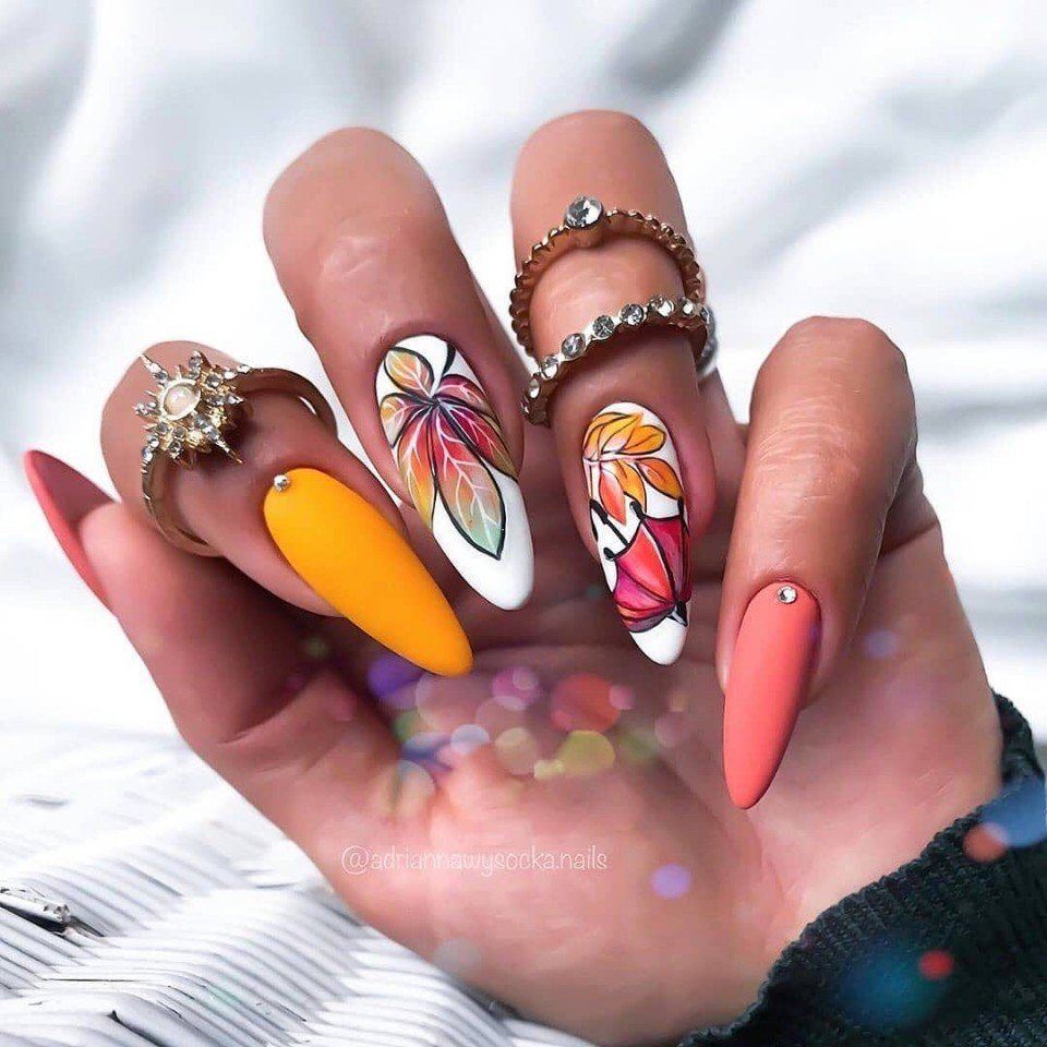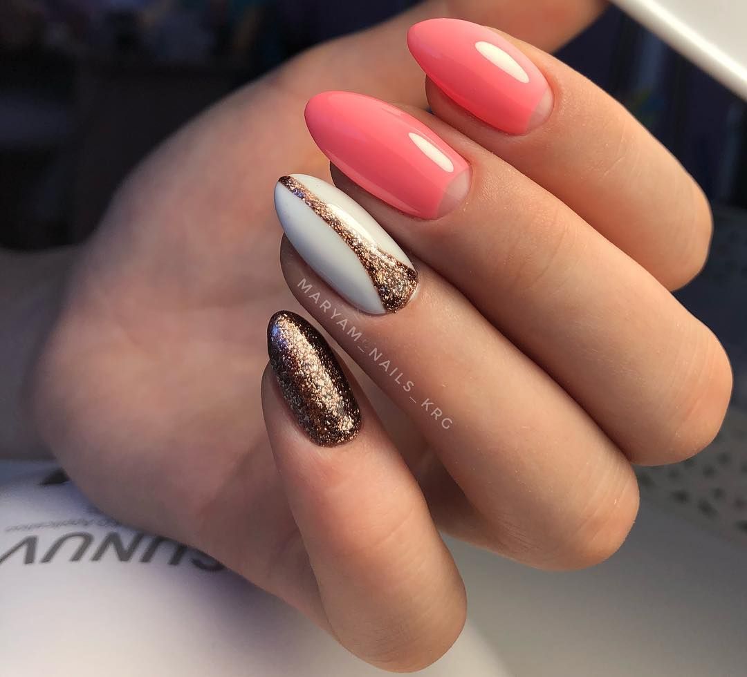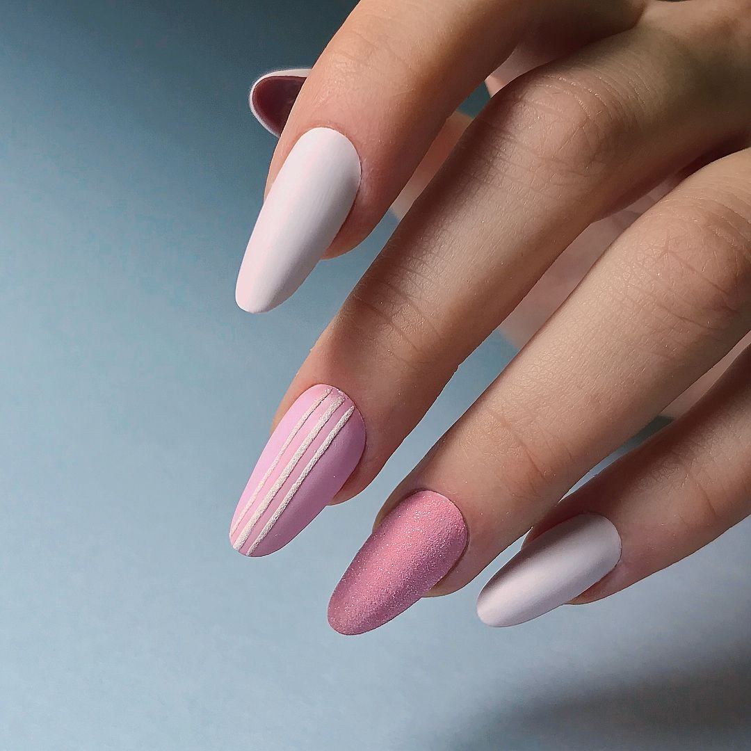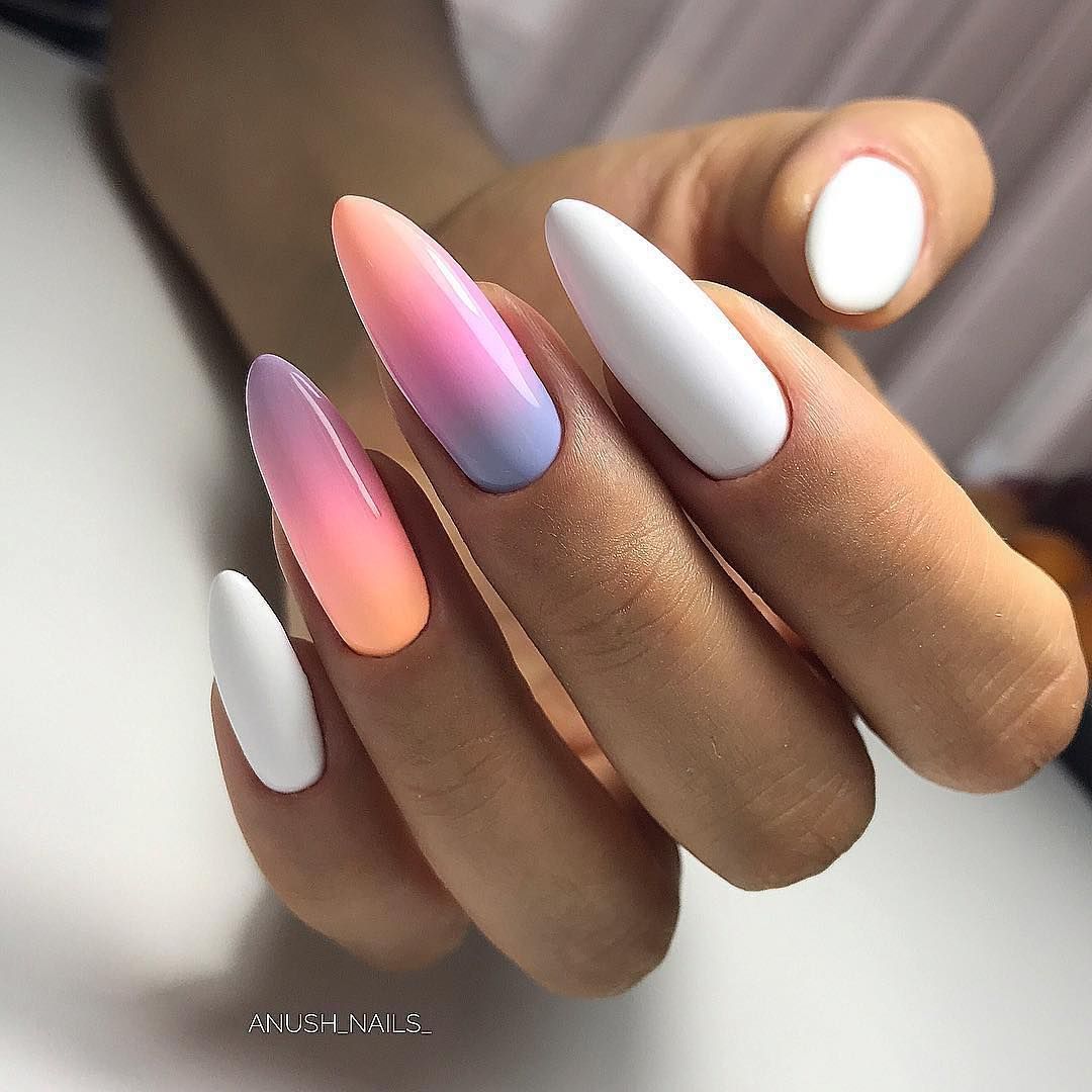 Рисуйте поверх белого мелкие цветные рисунки — это отличный «холст» для воплощения любых художественных идей. Пример фото ногтей «миндаль» ниже.