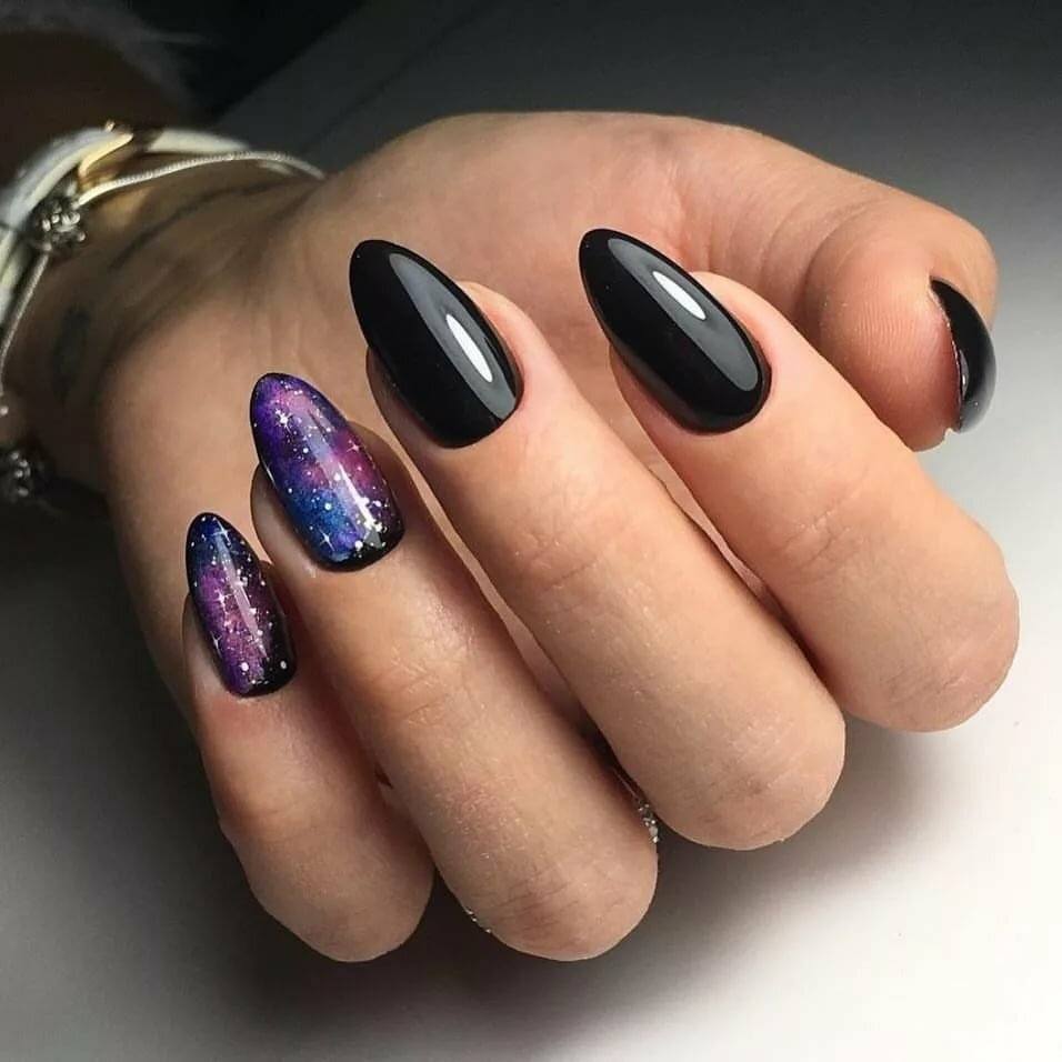 Или поступите по-другому — нарисуйте эти галактические элементы поверх однотонного покрытия, используя контрастный лак или глиттер.