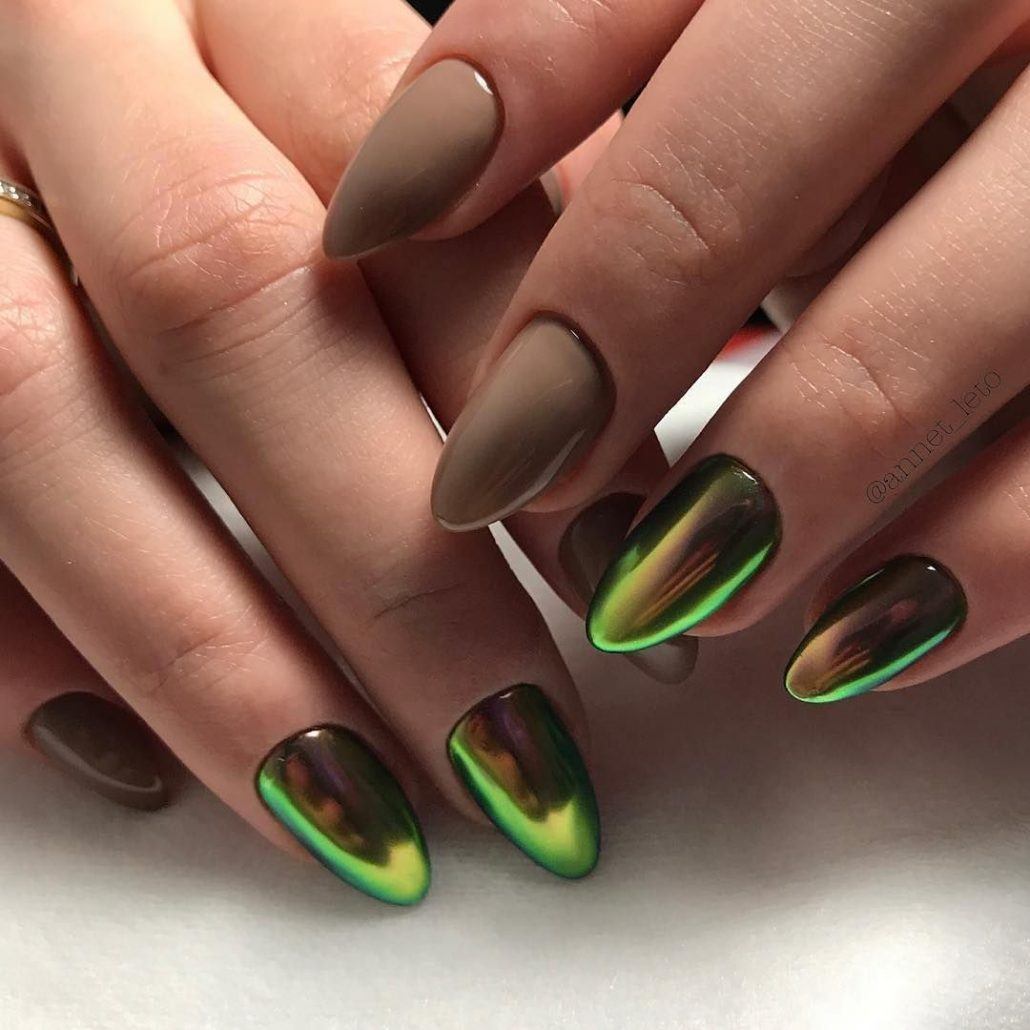 Зеленый цвет имеет очень богатую палитру оттенков лаков и каждый из них выглядит потрясающе, так что можете смело выбирать зеленый маникюр и комбинировать его с камифубуки, втиркой, камушками или блестками.
