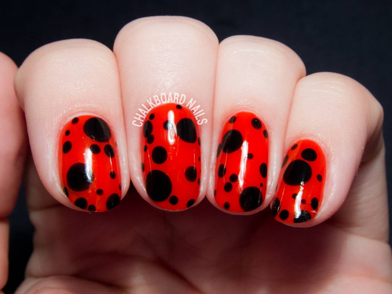 Очень милый маникюр, который напоминает нам окраску божьей коровки, можно выполнить, как вы уже догадались, с помощью доттеров различной величины.