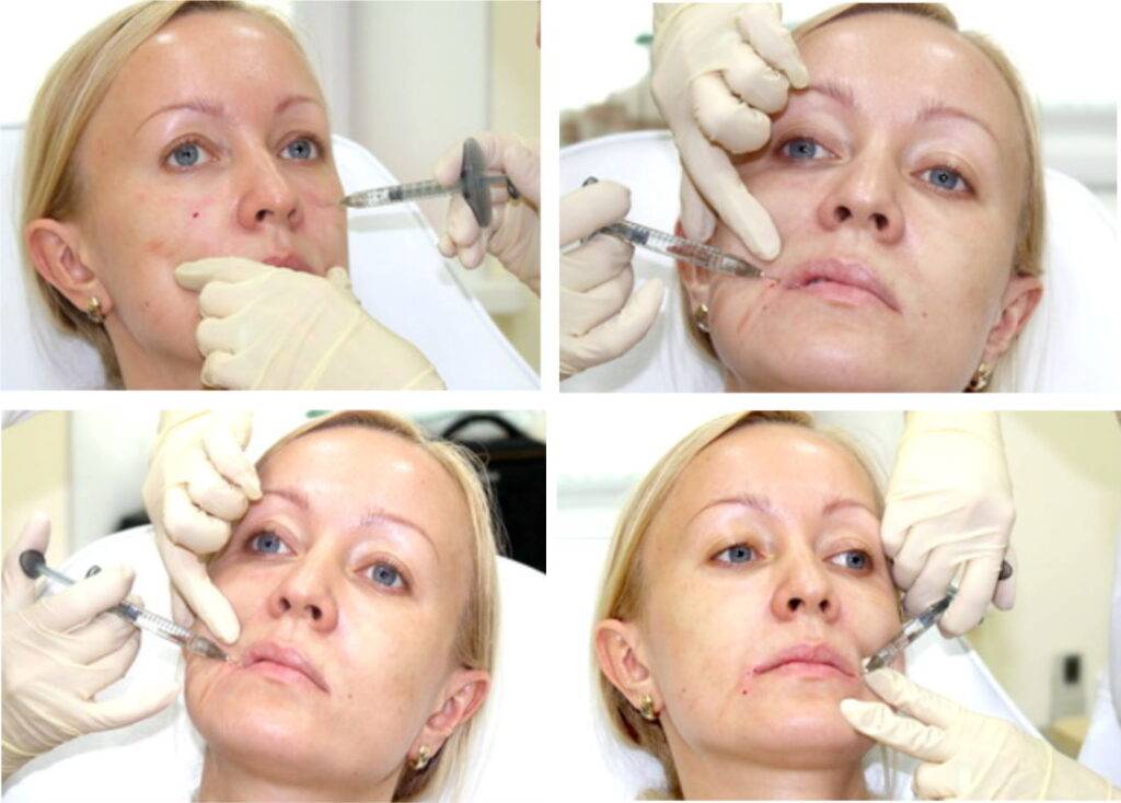 До процедуры врач снимает макияж и обеззараживает зону губ. Инъекции делаются очень тонкой иглой, иногда применяются гибкие канюли для ввода препарата. Для зоны губ используют препарат объемом 0.5 – 0.6 мл. Для стойкого длительного эффекта рекомендуется провести от двух до пяти процедур с перерывом на 2-3 недели. Количество процедур и интервал между ними, как и конкретный препарат, определяет врач, исходя из состояния кожи пациента, его возраста и задачи. В конце процедуры врач снова обеззараживает область инъекций и может немного её помассировать для лучшего распределения препарата.