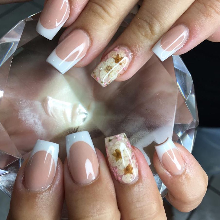- Смотрите, как красиво и элегантно смотрится френч с цветочной тематикой, украшенный бульонками на основе миндалевидной формы.