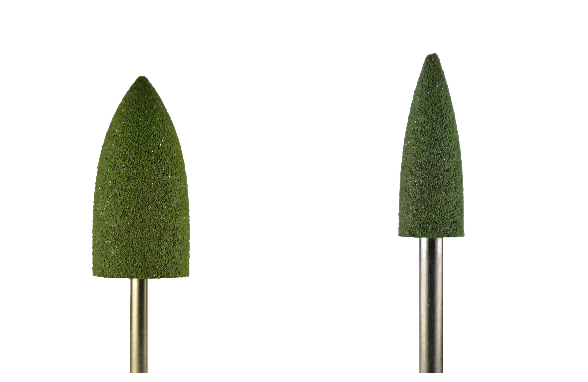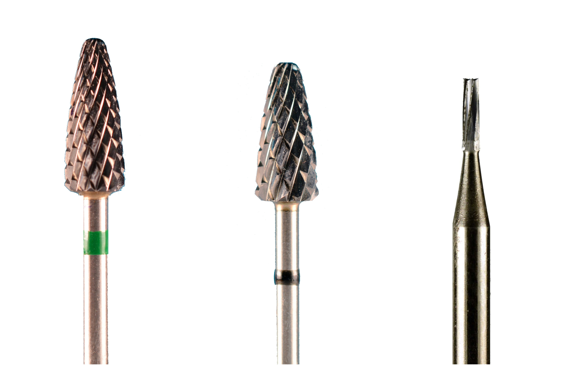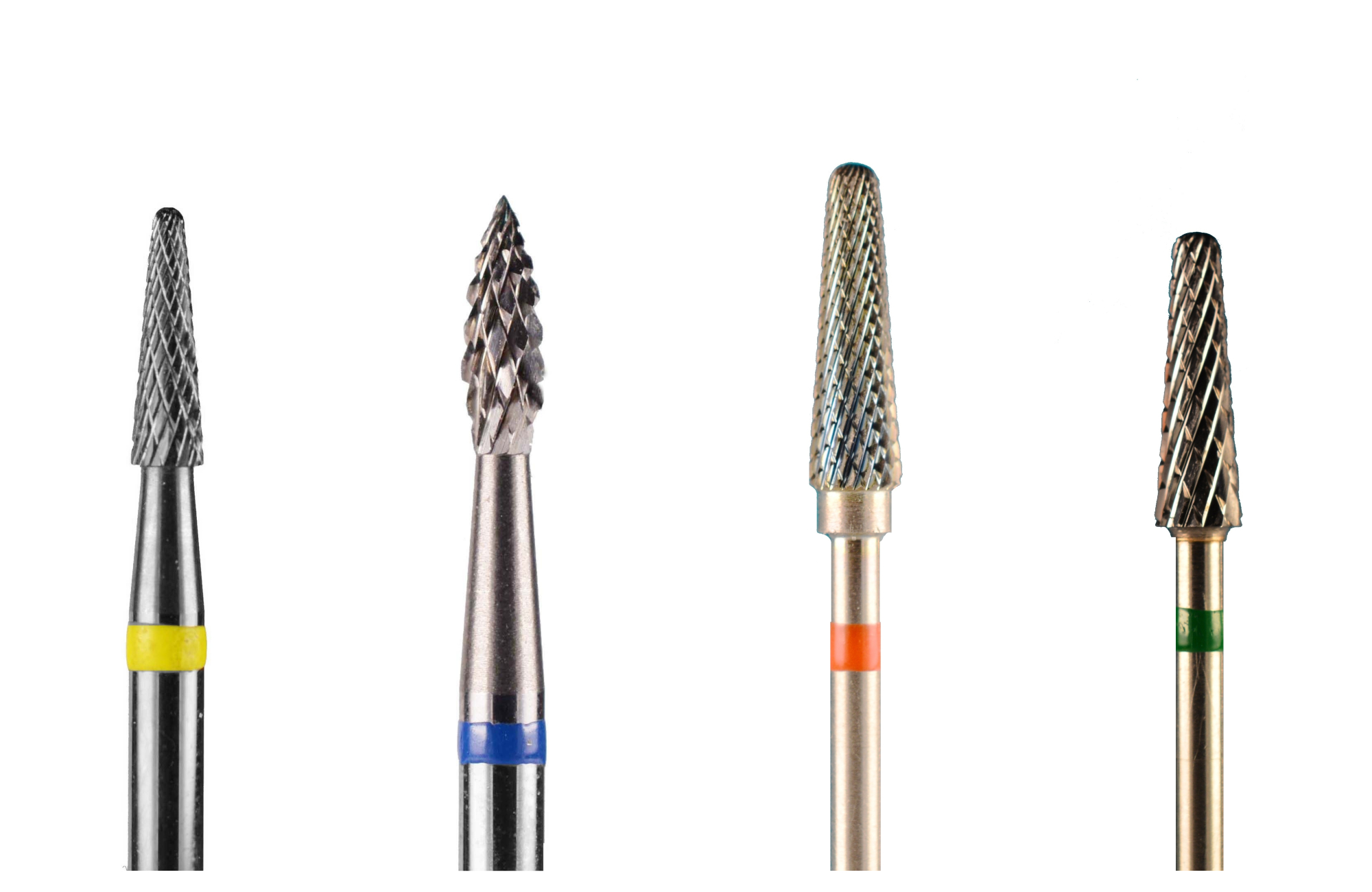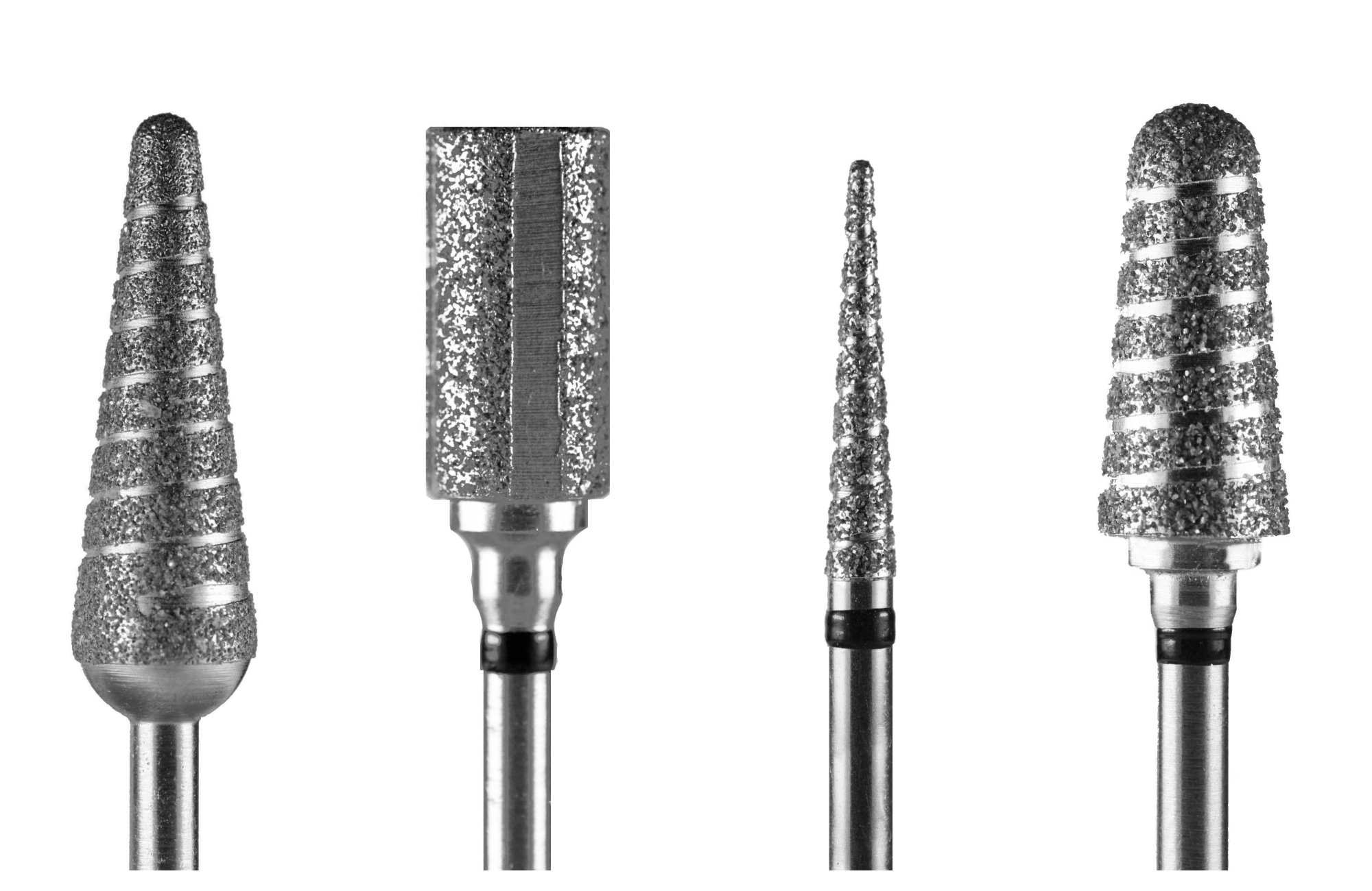 Более грубая насечка (черная, зеленая) обеспечивает снятие большего количества материала, синяя полоска — средняя абразивность, а фрезы с красной и желтой полосками предназначены для ювелирной работы. Также хороши алмазные насадки с грубой абразивностью или со спиральной насечкой «турбо», позволяющей более эффективно производить обработку ногтей.