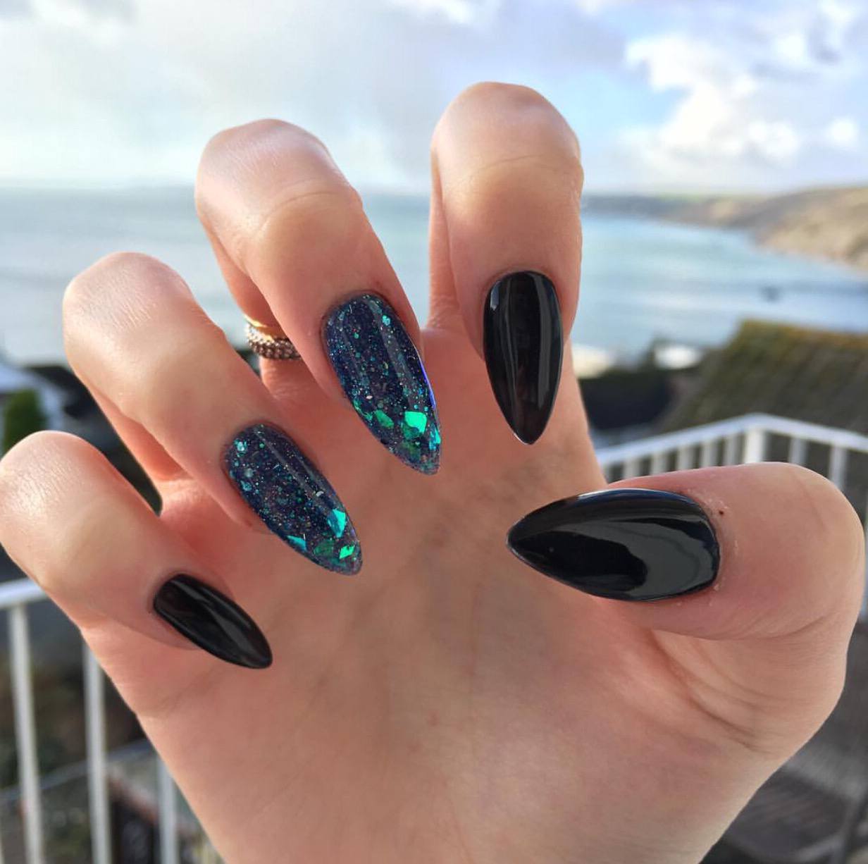 Блестки и глиттер – довольно популярное решение. Главное – не переборщить. Если выбрали глиттер, то блестки лучше не брать. А можно остановиться на варианте легкой россыпи блеска и акценте в виде контрастного рисунка на одном из ноготков.