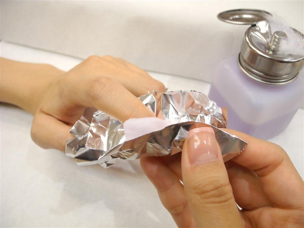 Для удаления используется специальная жидкость. Если слой получился плотным, сначала по нему проходятся бафом. Это делает поверхность пористой. Затем раствор для удаления наносят на салфетку, прижимают к ногтевой пластине, плотно окутывают фольгой. По прошествии 15 минут материал готов к удалению. При необходимости поверхность ногтевой пластины снова обрабатывают бафом. Чем мягче проведено удаление, тем больший эффект даст укрепление.