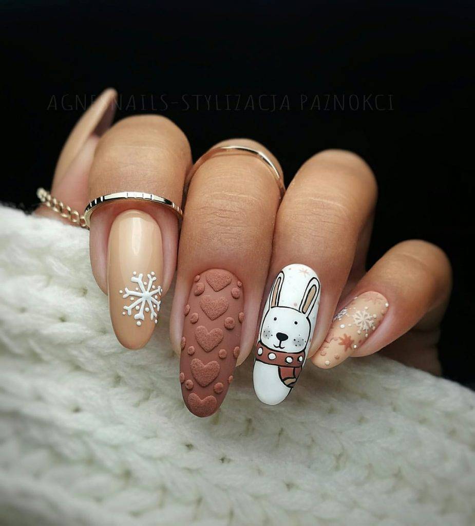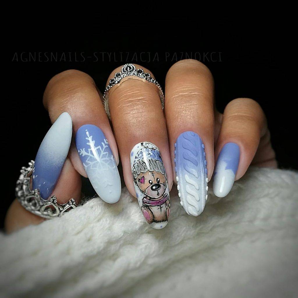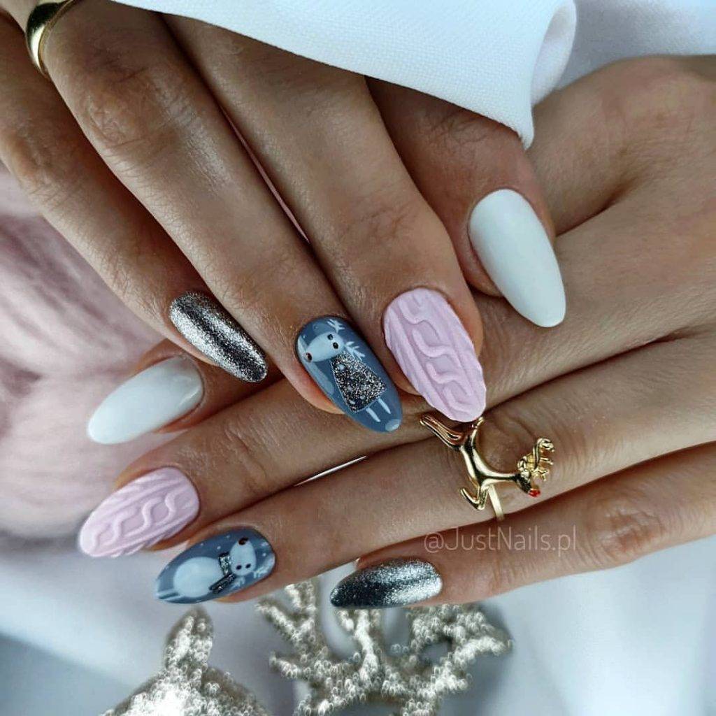 Большой популярностью пользуется снеговик Олаф, который в паре с вязаными ногтями смотрится потрясающе. В зимнем маникюре 2021-2022 вязаный дизайн с изображениями животных остается одним из самых трендовых.