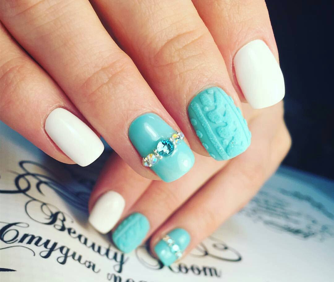 Также нежный вязаный маникюр в пастельных и оттенках нюд можно красиво дополнить бусинкой, стразиком или аккуратным камушком, либо выполнить маникюр с принтами и дополнить один либо несколько пальчиков вязаным узором.