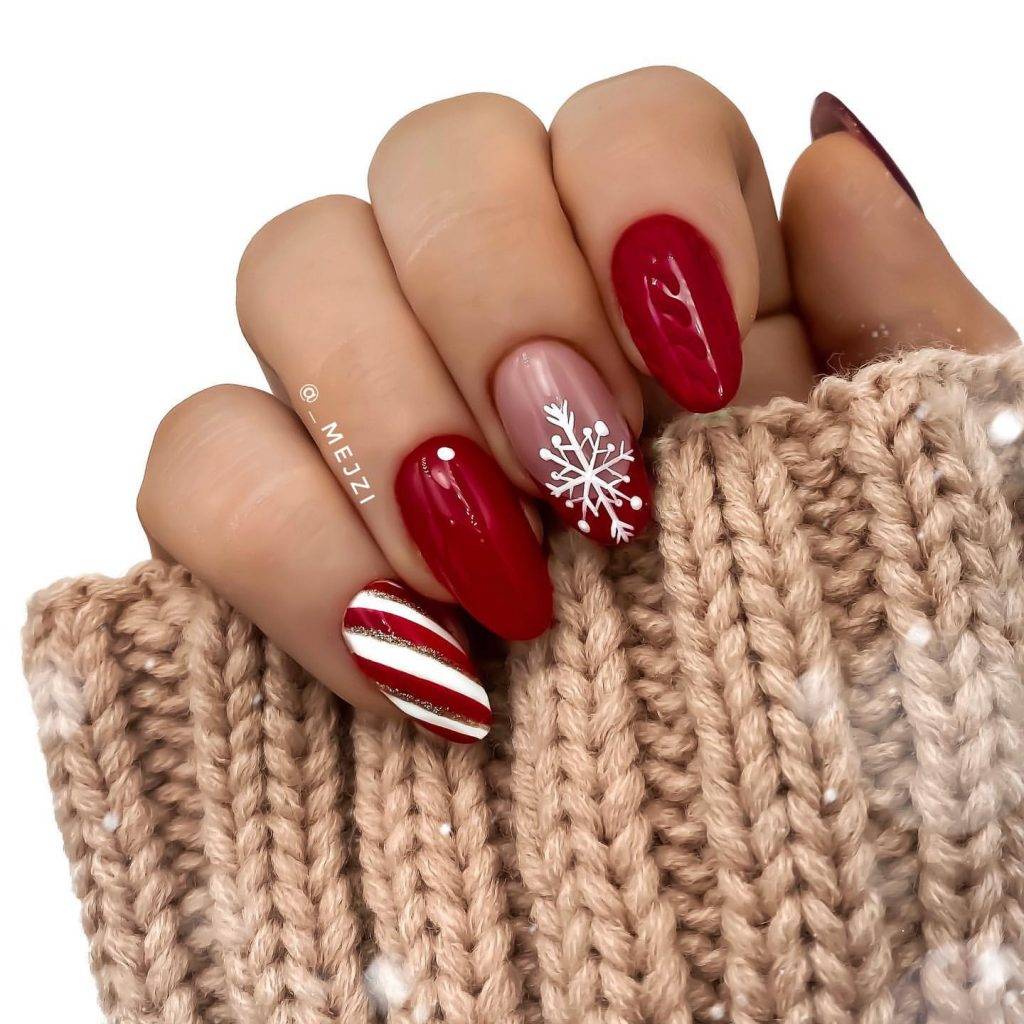 Какой зимний маникюр 2021-2022 и без красивых снежинок, которые тоже могут стать роскошной идеей для дизайна в стиле вязаного свитера. Снежинки можно нарисовать разными способами, использовать слайдеры или стемпинг или выложить стразами.