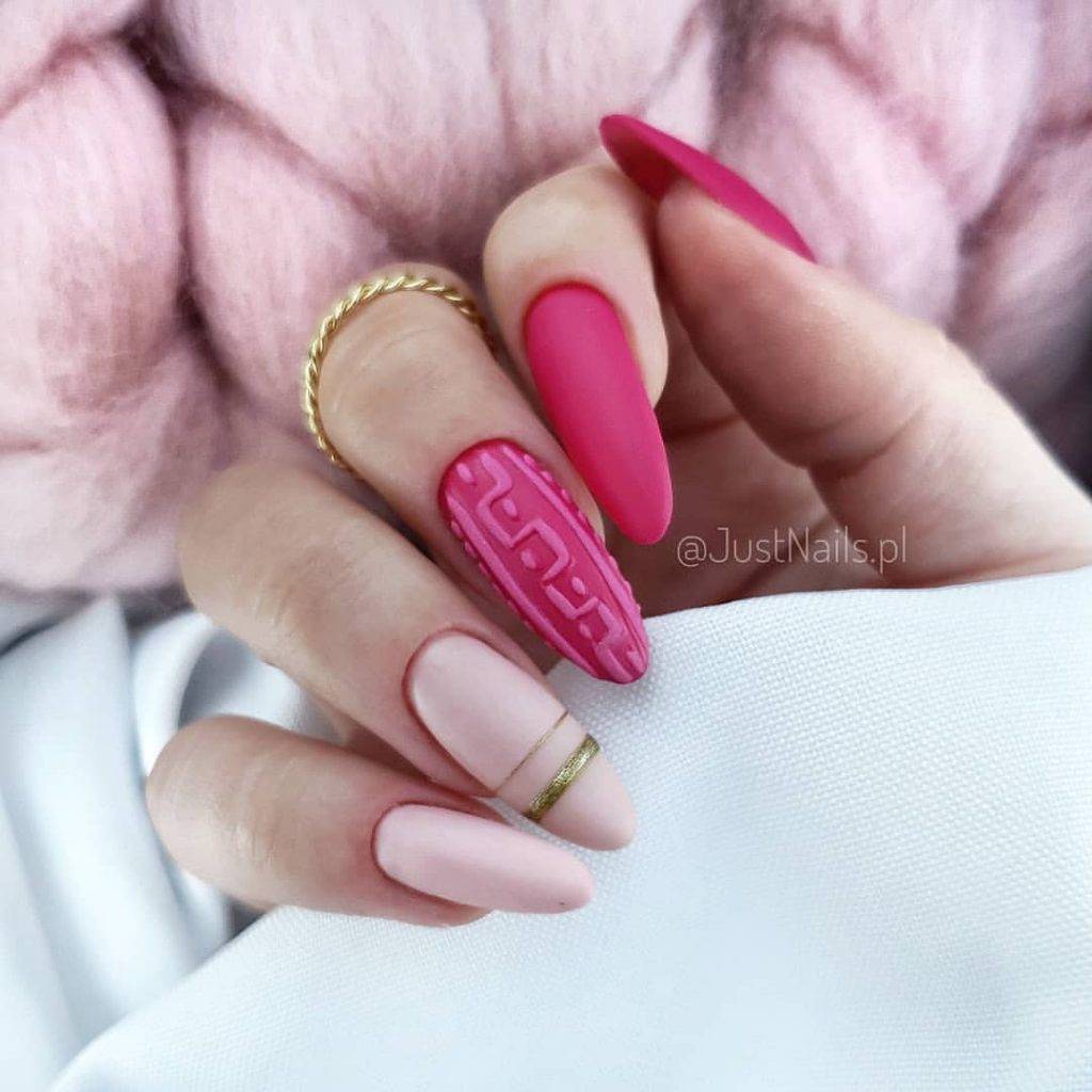 Здесь мы хотим показать модные варианты вязаного маникюра 2021-2022 сочетающие разные фактурные узоры. Несмотря на различие рисунков, вязаный маникюр остается гармоничным.