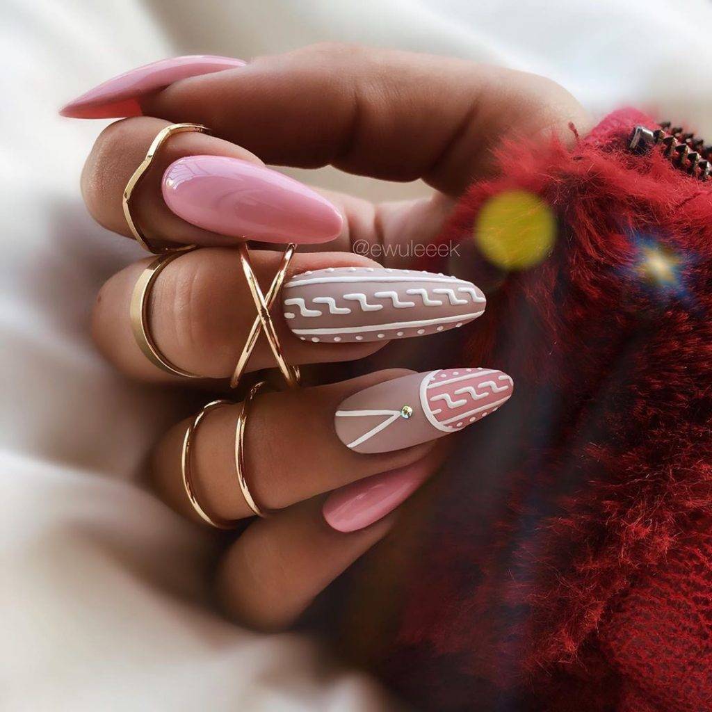 Мягкие светлые тона идеальны в дизайне маникюра свитер. Нежно-розовый, голубой, нюдовые и бежевые тона даже в монохромном вязаном маникюре 2021-2022 смотрятся очень привлекательно.