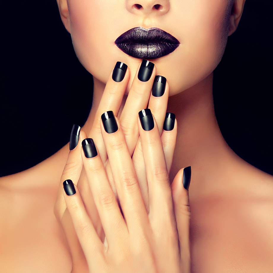 Кроме простого черного актуальны насыщенные чернильные оттенки синего и фиолетового. Из простых узоров, которые ты можешь повторить самостоятельно – мраморные разводы и точки. Структура гель-лака позволяет перекрыть черный даже белыми орнаментами.