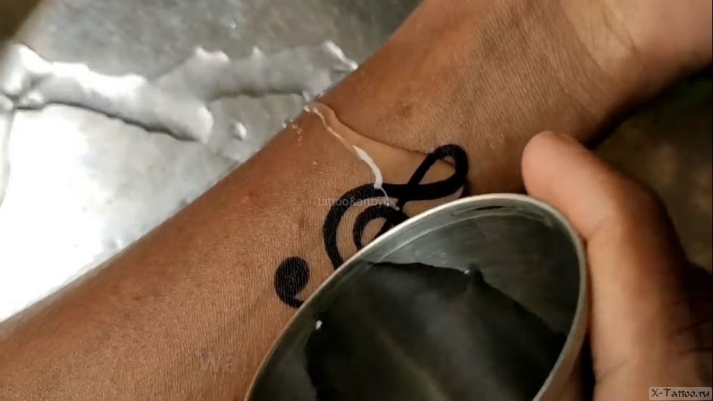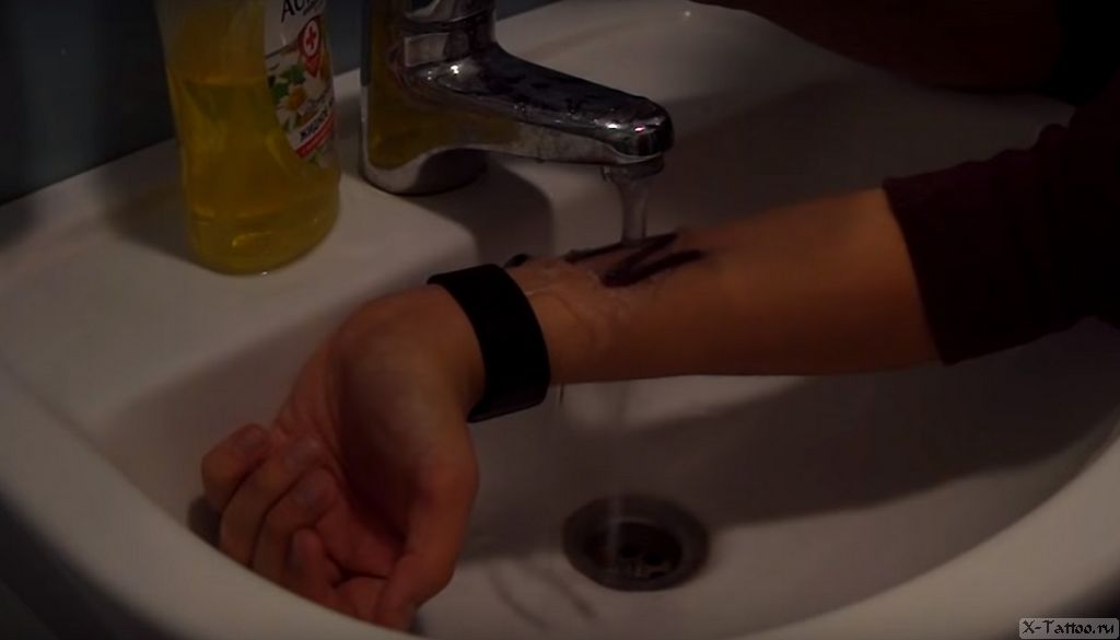 Аккуратно сполоснуть небольшим количеством воды тату, чтобы смыть частицы клея.