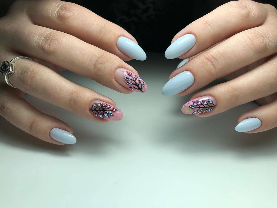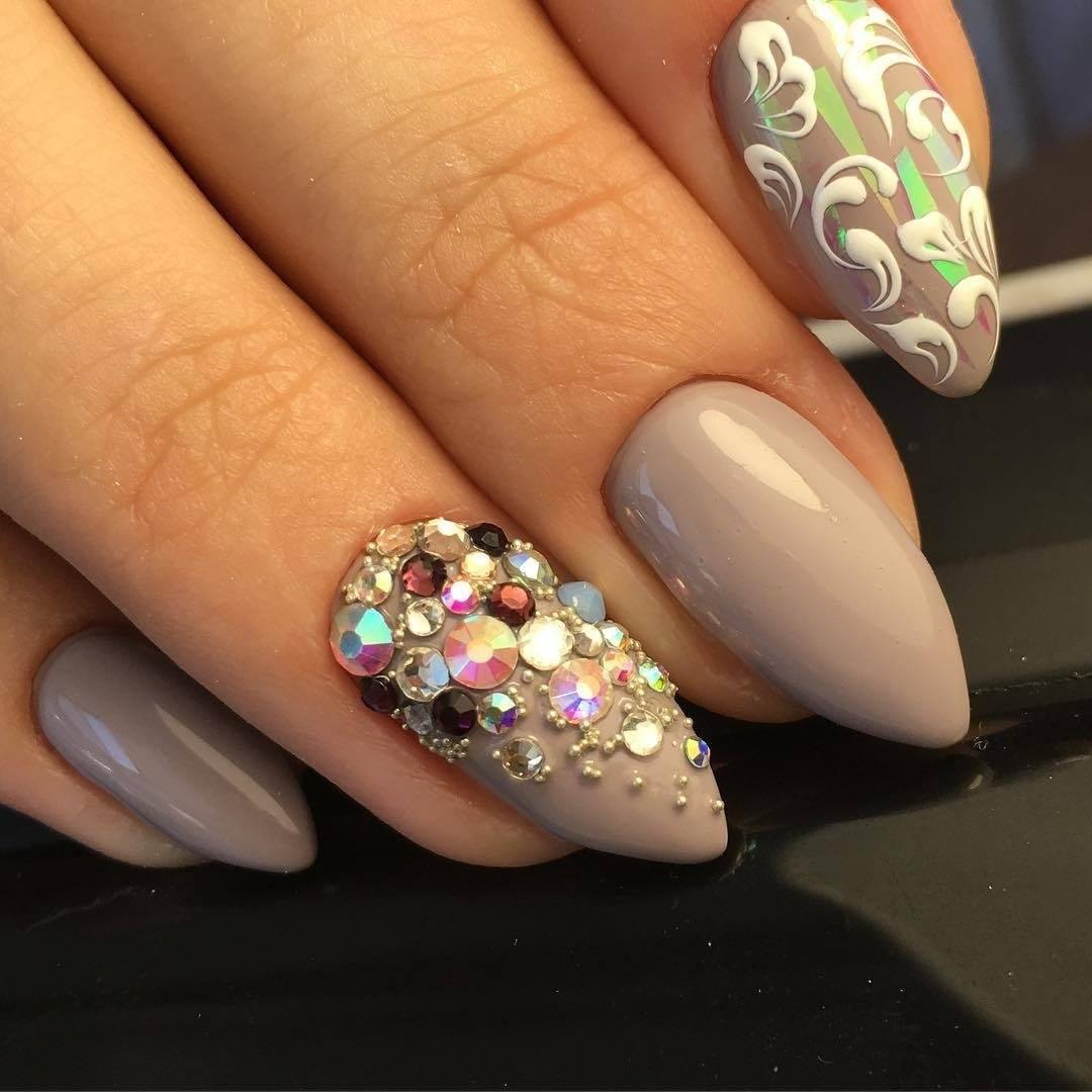 Помимо стиля минимализм популярностью пользуются нейл-арты с выкладкой композиций из стразов разного размера, бульонок, пайеток. Декор выполняется на одном из ноготков, а остальные ногти покрываются однотонным светлым оттенком гель-лака. Это позволяет компенсировать излишне яркий и объемный декор и создать сбалансированный и стильный маникюр.