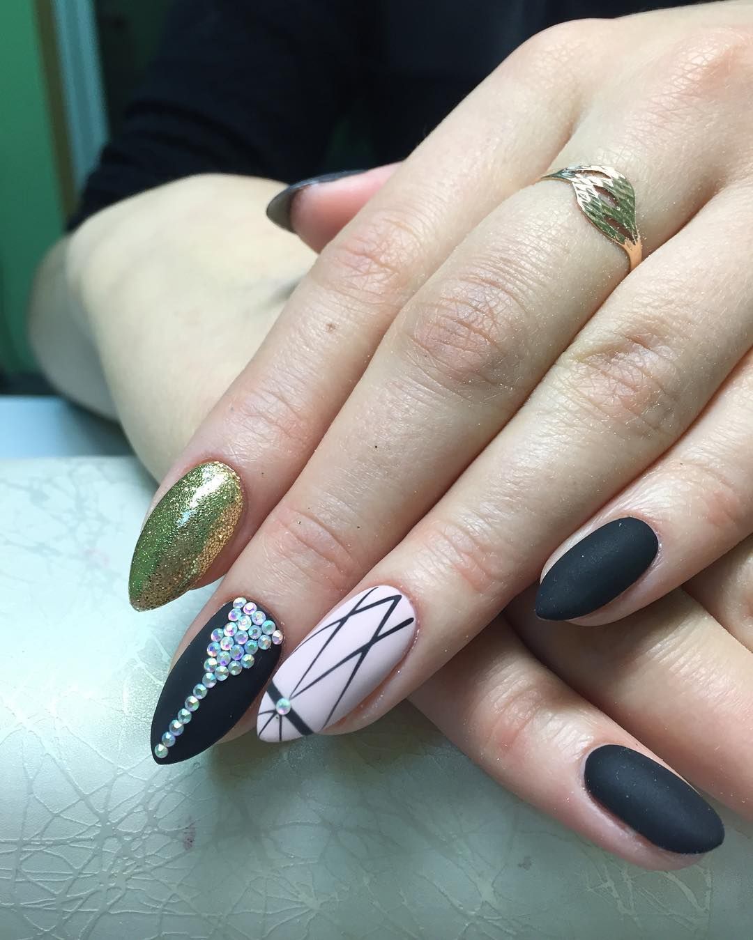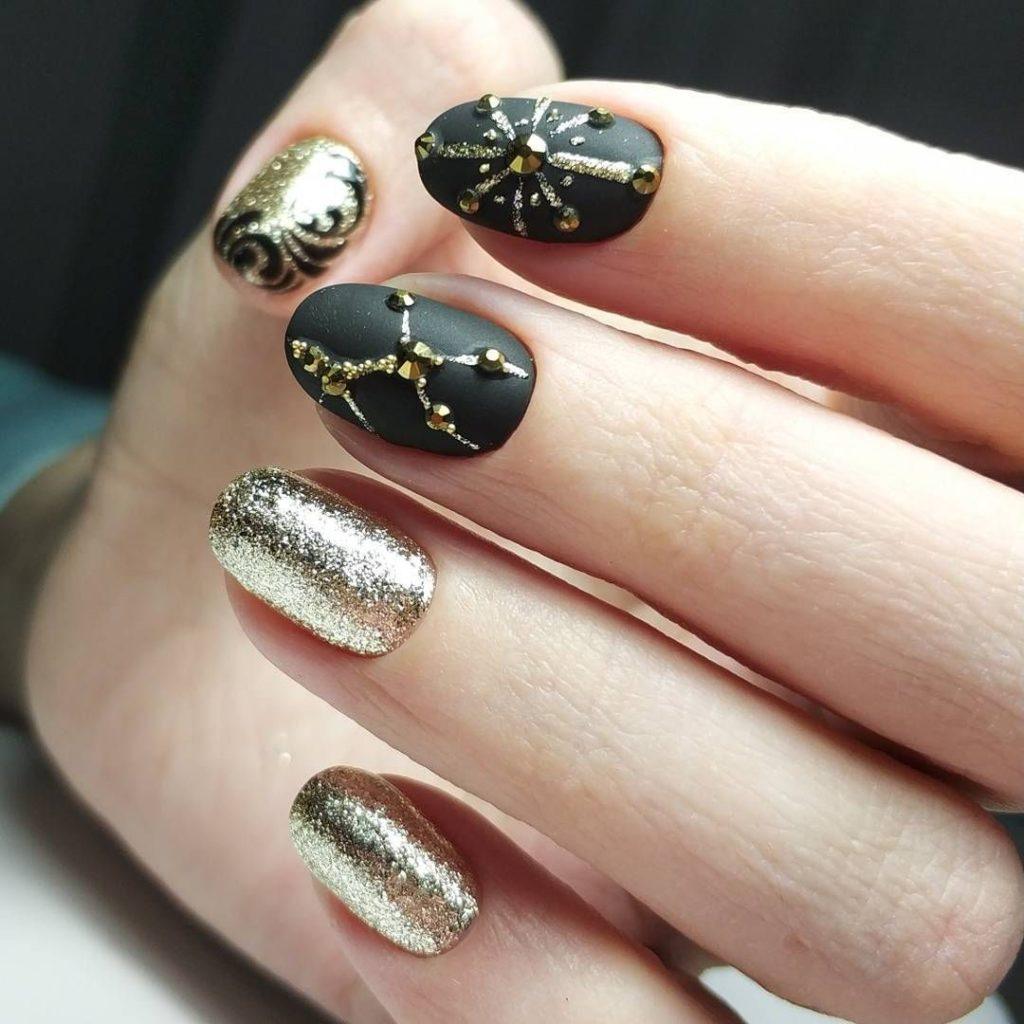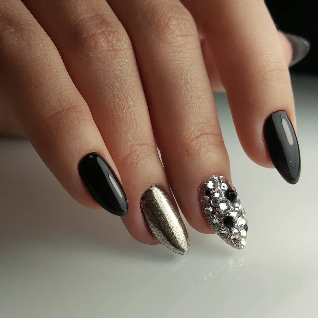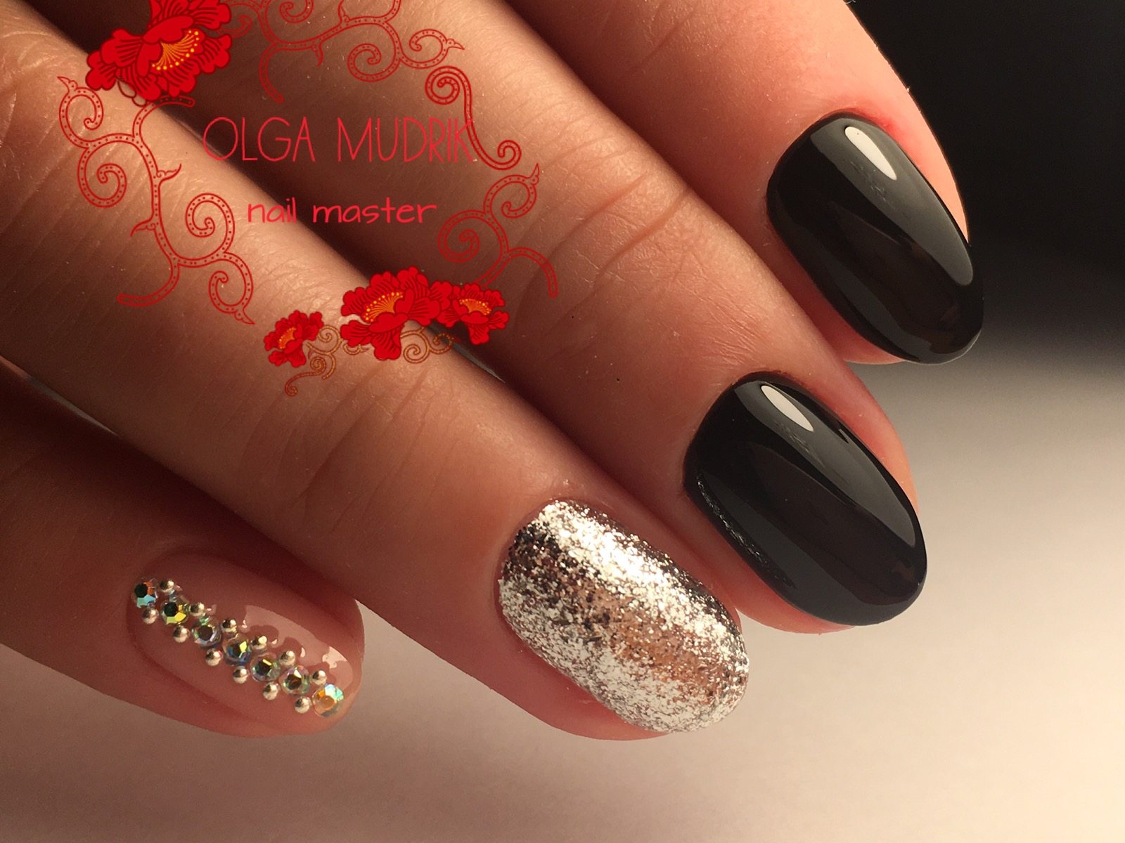 Как же без блеска!? Золото и черный – элегантнее сочетания в маникюре не найти, а добавление страз добавит роскоши и шика.