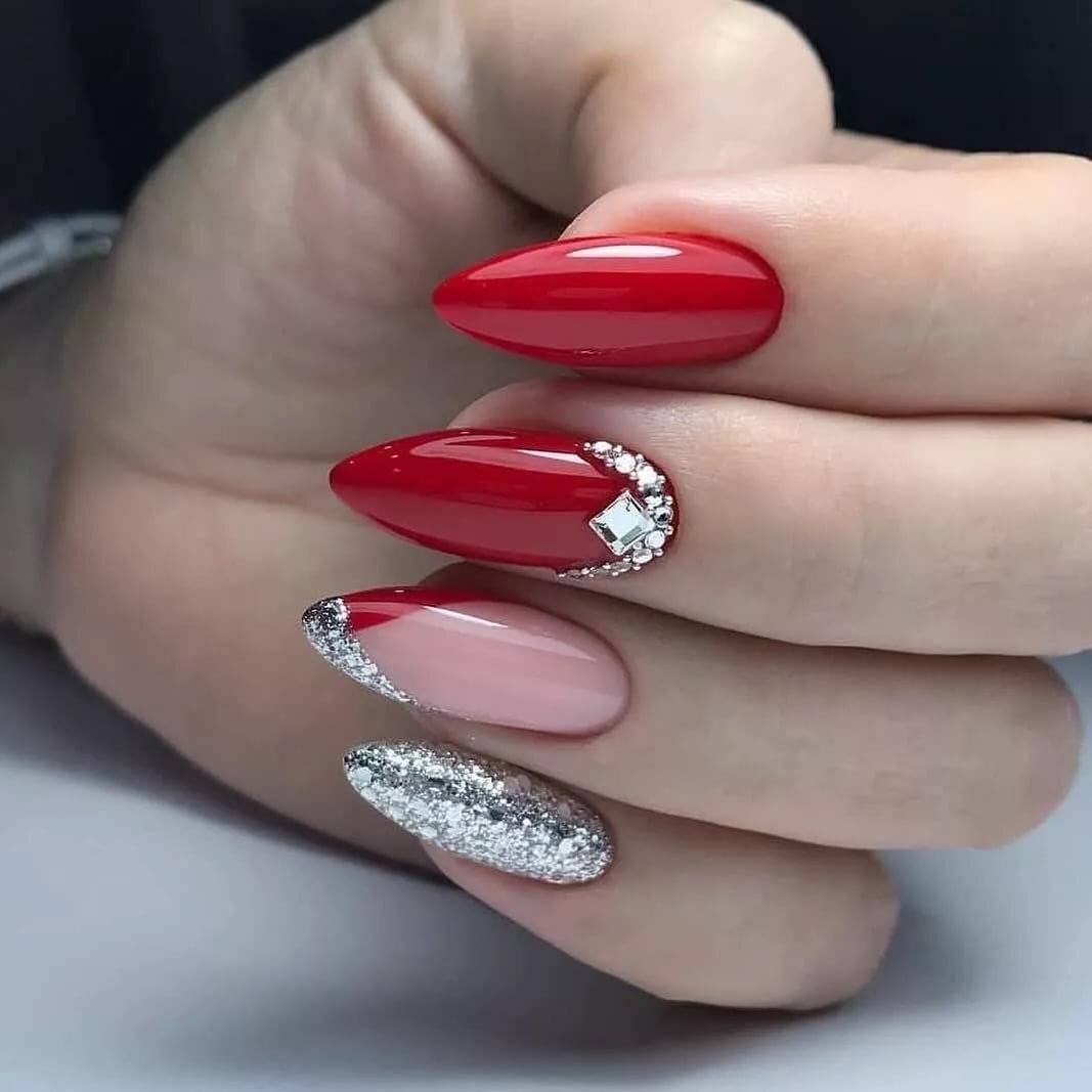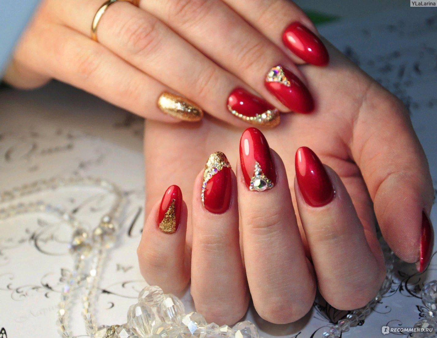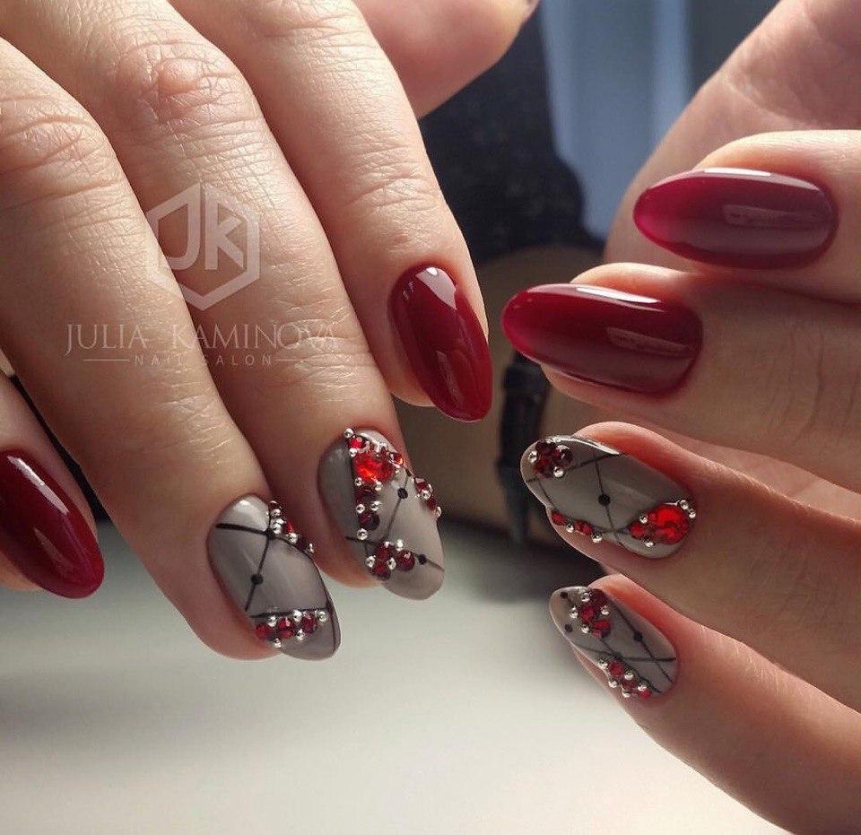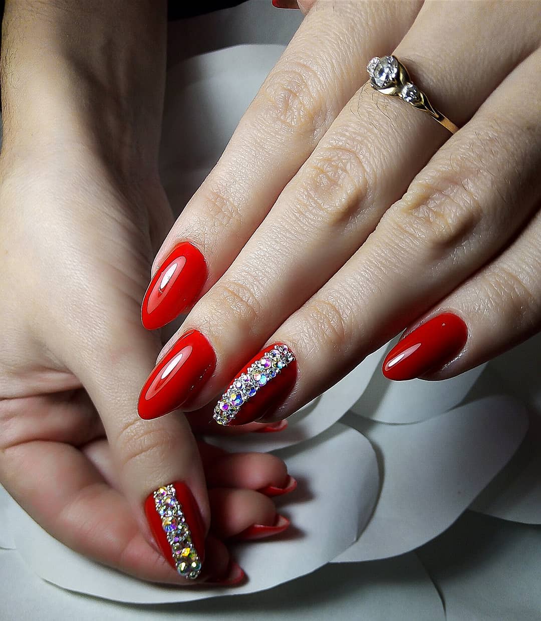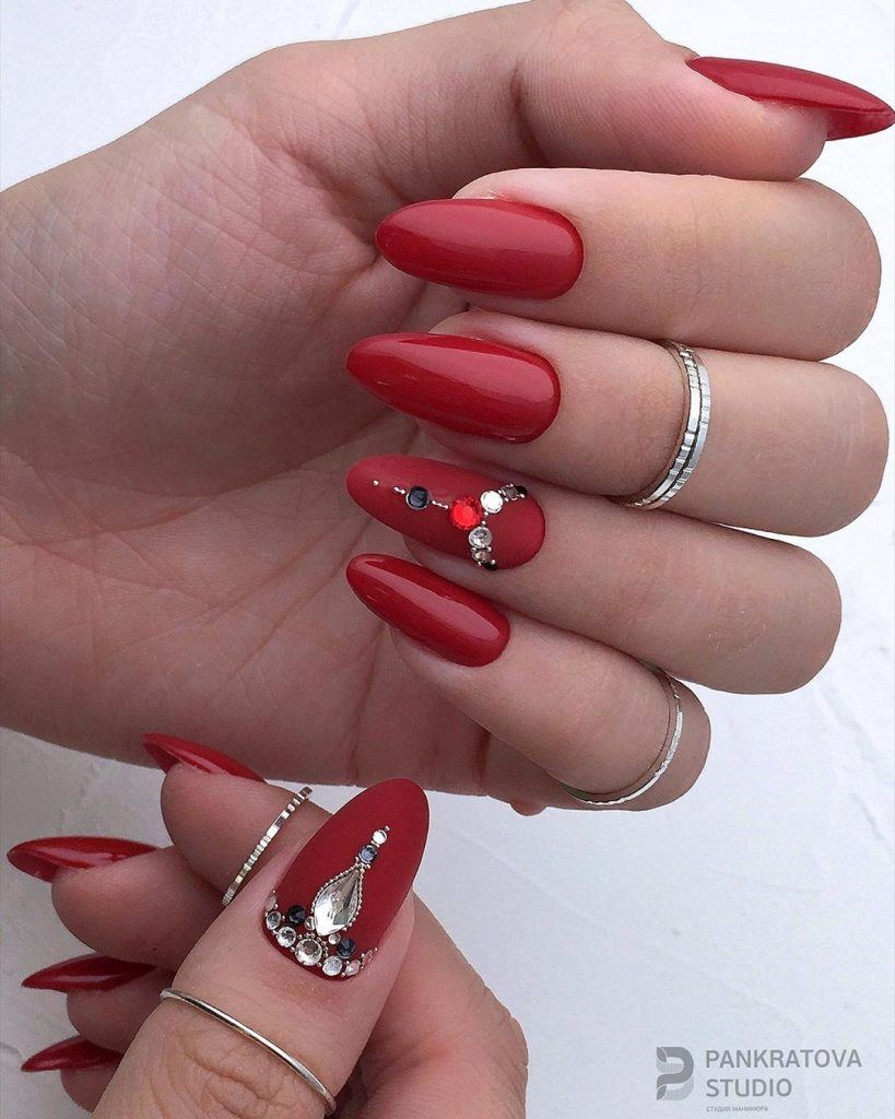 Красный маникюр со стразами подходит стильным, уверенным в себе женщинам. Чтобы убрать излишнюю яркость, покройте ногтевые пластины матовым лаком. А в качестве украшения используйте белые круглые стразы, похожие на жемчуг. Для вечернего выхода дополните образ красной сумочкой и помадой.
