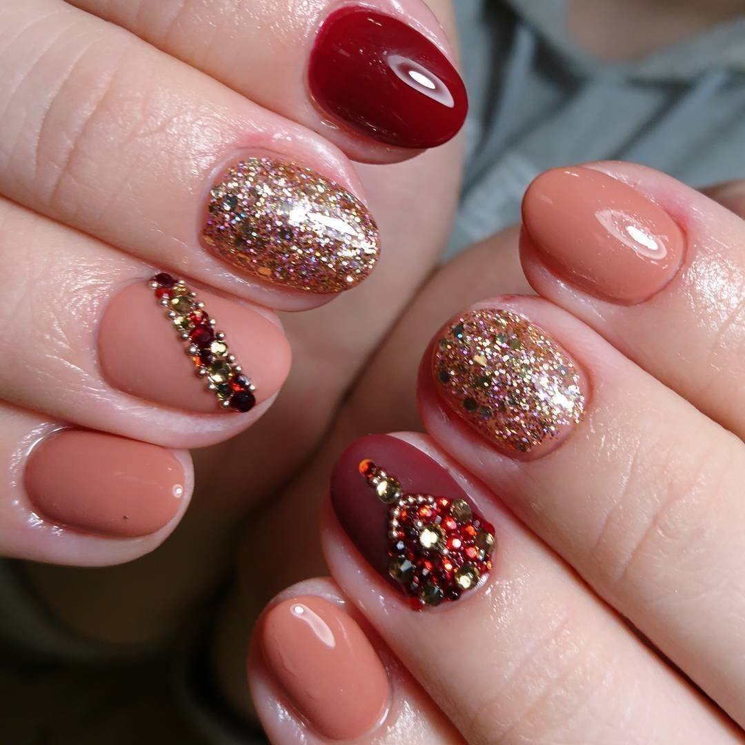 Располагайте стразы в прикорневой зоне на одном из ноготков, выделите место под дизайн блестками, пайетками или глиттером