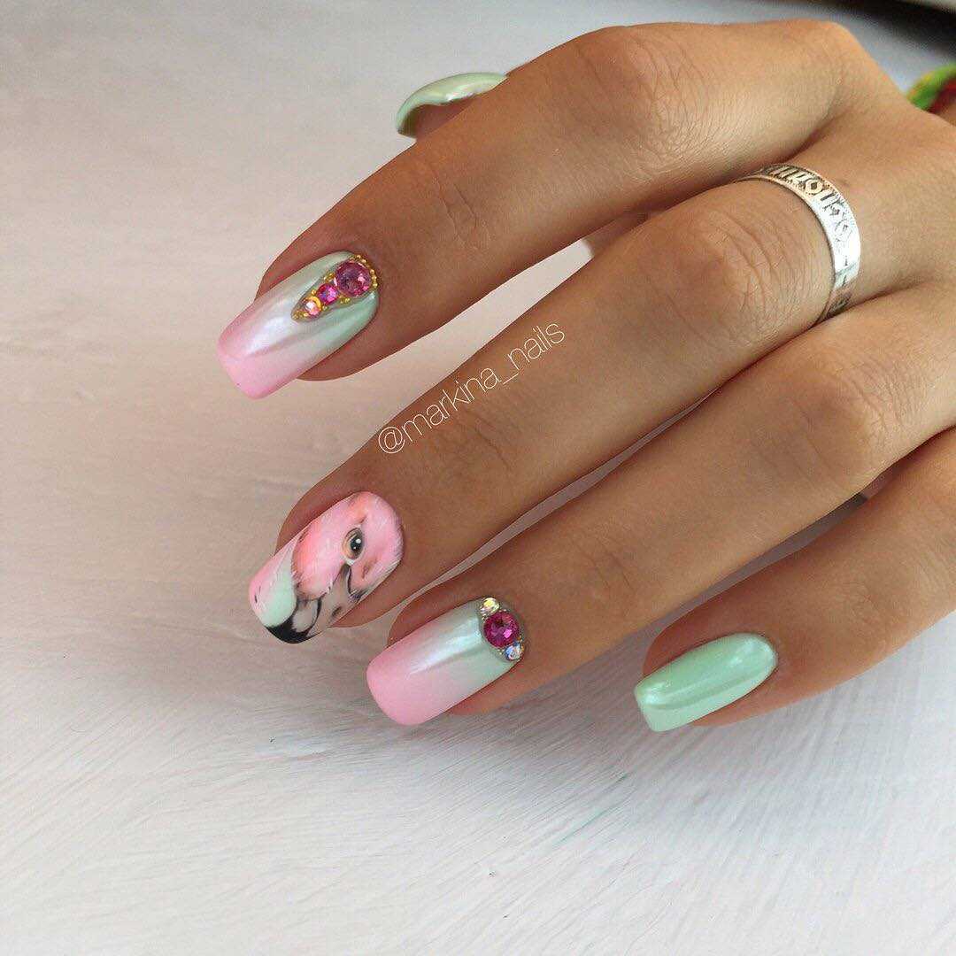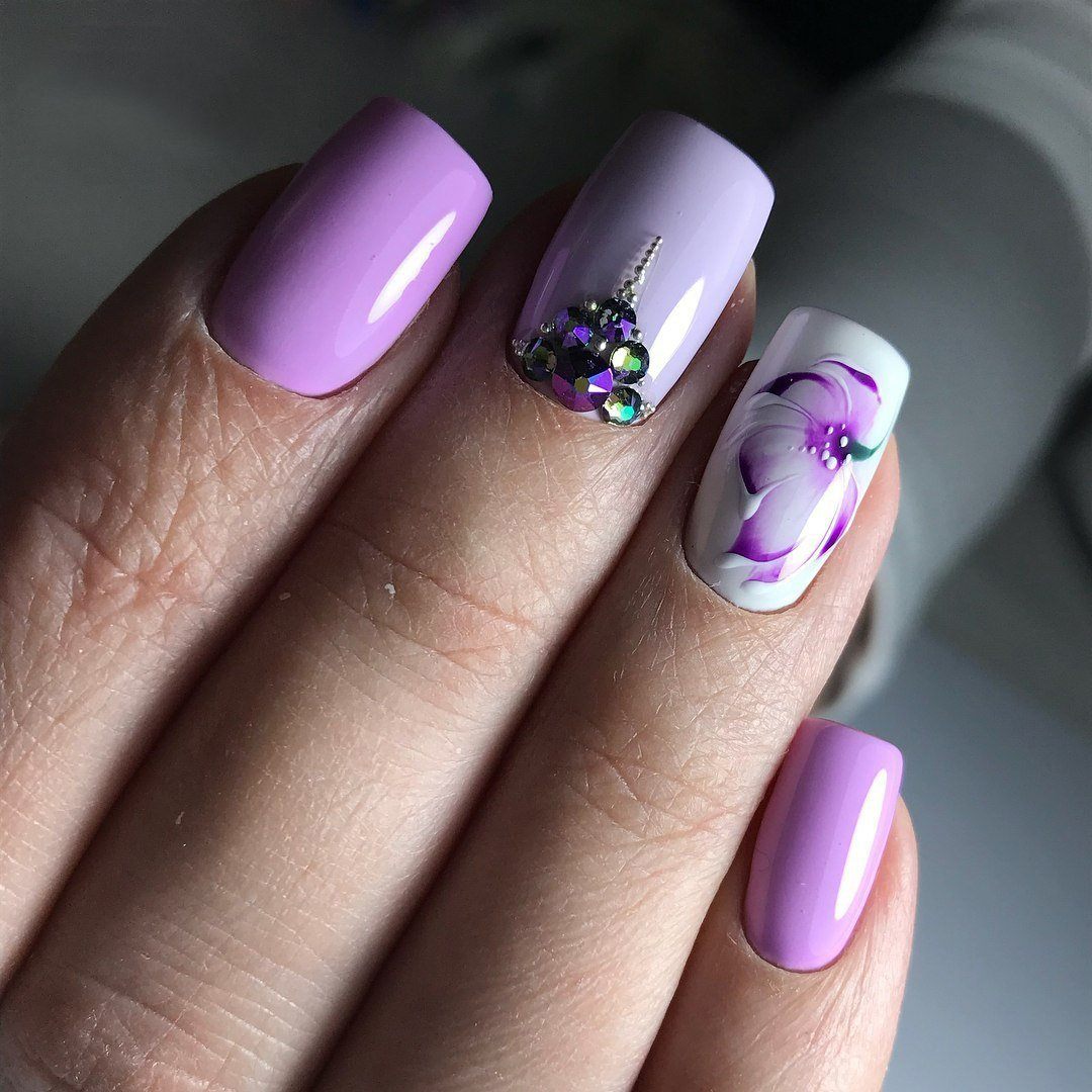 Если в дизайне ногтей используются не только стразы, а в дополнение выполняется рисунок, то цвет страз хорошо подобрать под цвет основного рисунка либо цветка.