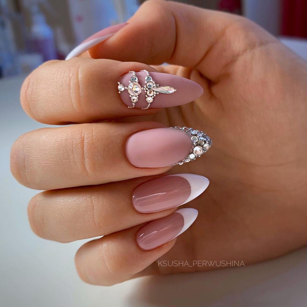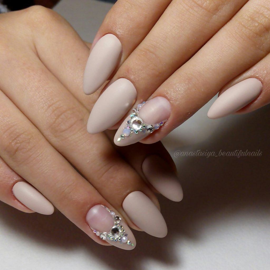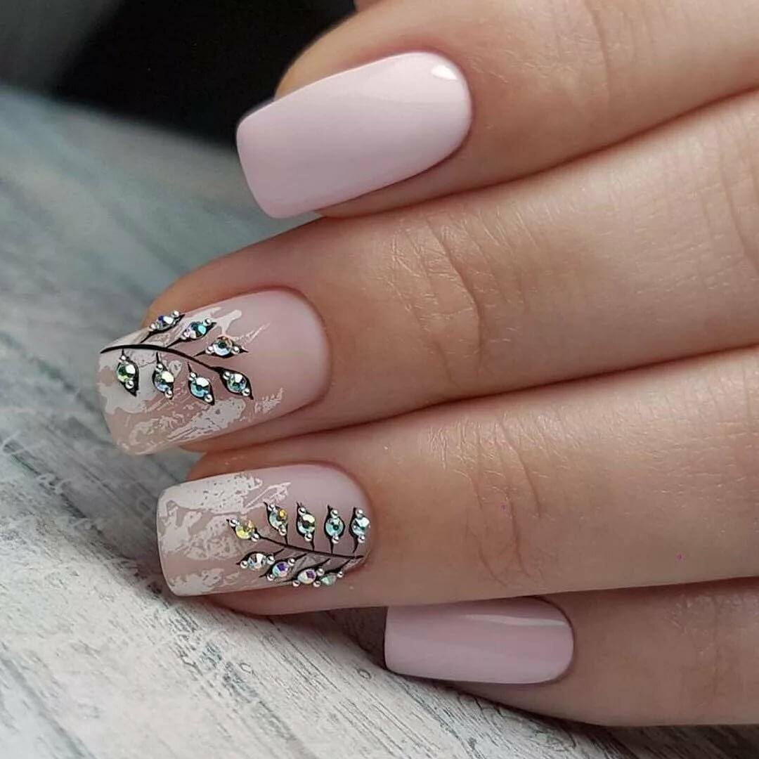 С помощью нюдовых оттенков можно создать нежный маникюр со стразами. Такой дизайн ногтей подходит как юной девушке, так и пожилой женщине. Одним из наиболее красивых расцветок считается матовое покрытие ногтевой пластины, украшенное рисунком такого же цвета, но в глянцевом исполнении. Стразы при этом могут быть прозрачными, золотистыми, серебристыми, белыми.