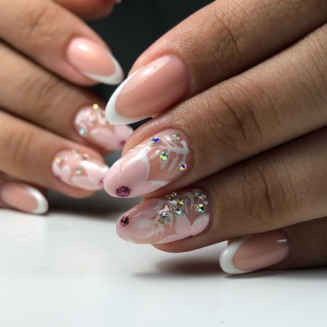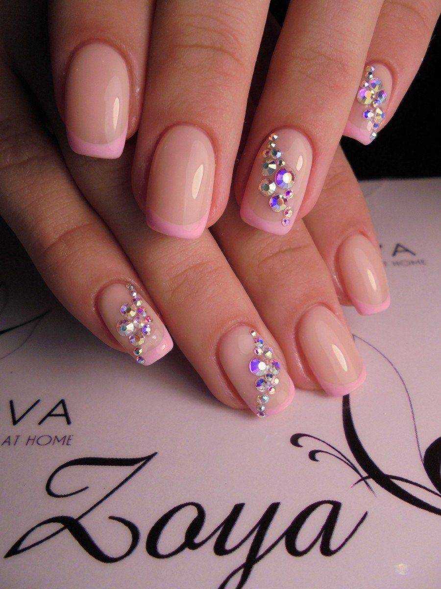 Френч – тот дизайн ногтей, который стерпит соседство с самым разнообразным декором. Именно стразы первые стали появляться во французском дизайне ногтей и удачно вписались в эту классическую технику маникюра.
