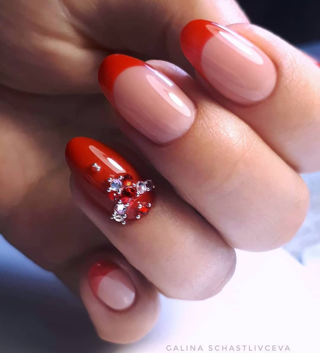 С белым френчем на ногтях отлично сочетаются стразы контрастных ярких цветов, например красные.