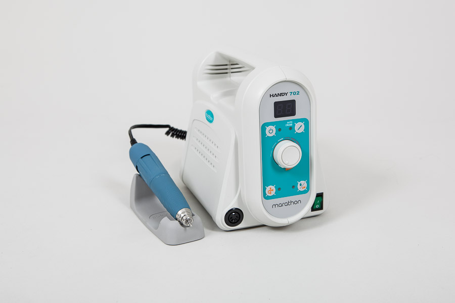 Ручка прибора очень легкая. Скорость показывается на небольшом мониторе. Фрезер идет в комплекте с педалью. Наконечник содержит углеродные щетки, что обуславливает его долговечность.