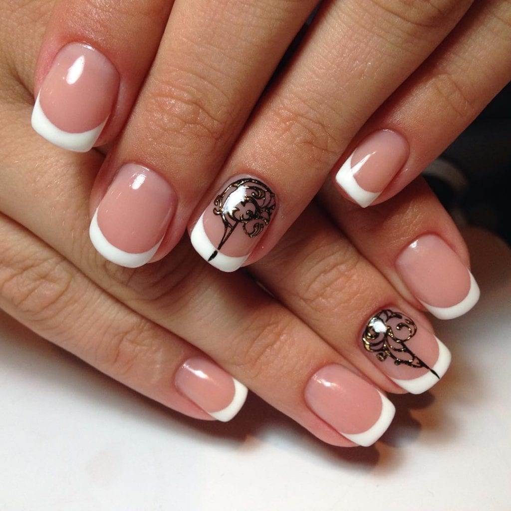 Французский маникюр выглядит достаточно стильно и оригинально. Он подразумевает под собой применение пастельного тона на ногтевой пластине, а также белой кромки на кончике ногтя. Иногда этот способ нанесения лаков подразумевает под собой выполнение рисунка или применение аппликаций. Он идеально подходит для работы, деловой встречи, свидания и любого торжества.
