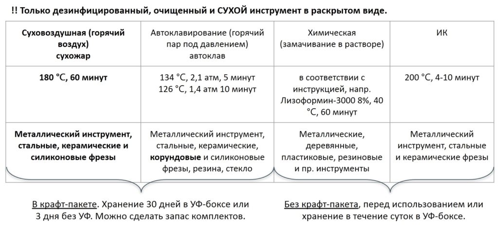 Ниже представлена таблица, в которой отражены наиболее популярные способы стерилизации маникюрного инструмента и, напрямую зависящие от выбранного способа, условия его хранения.